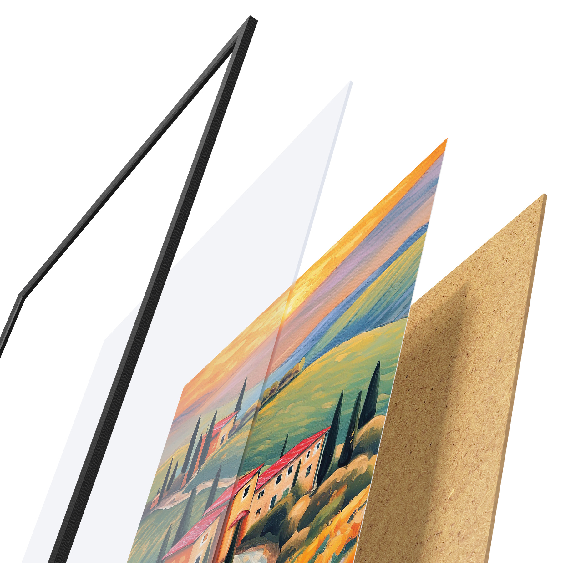 Il poster è composto da cornice, plexiglass, immagine stampata e supporto in truciolato. Il poster può essere immediatamente appeso alla parete grazie ai supporti sul retro.