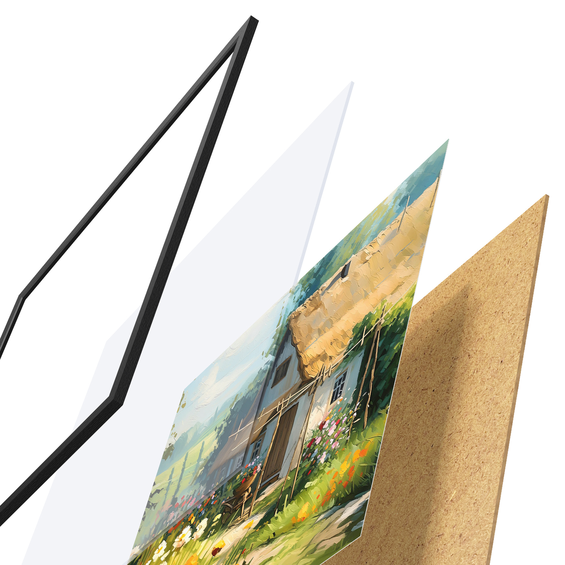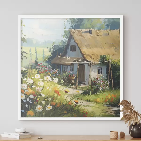 Poster Casa di paese con giardino, fiori estivi, pittura a olio, pennellate, campo, stile rustico Nr f38491