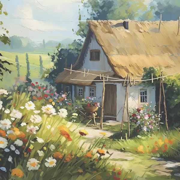 Poster Casa di paese con giardino, fiori estivi, pittura a olio, pennellate, campo, stile rustico Nr f38491