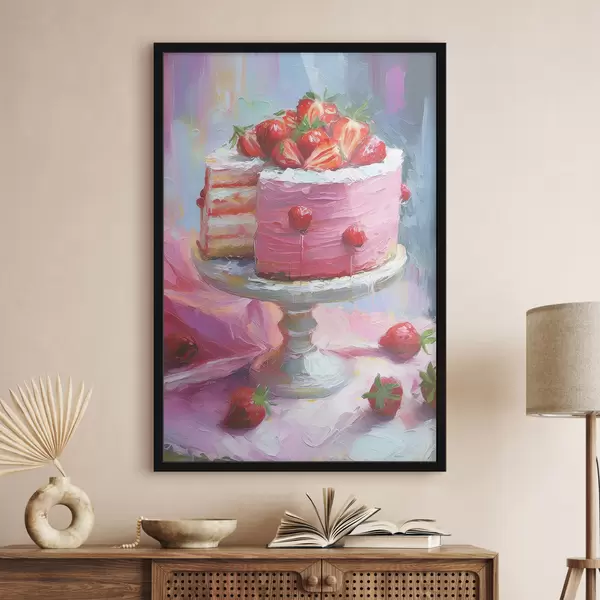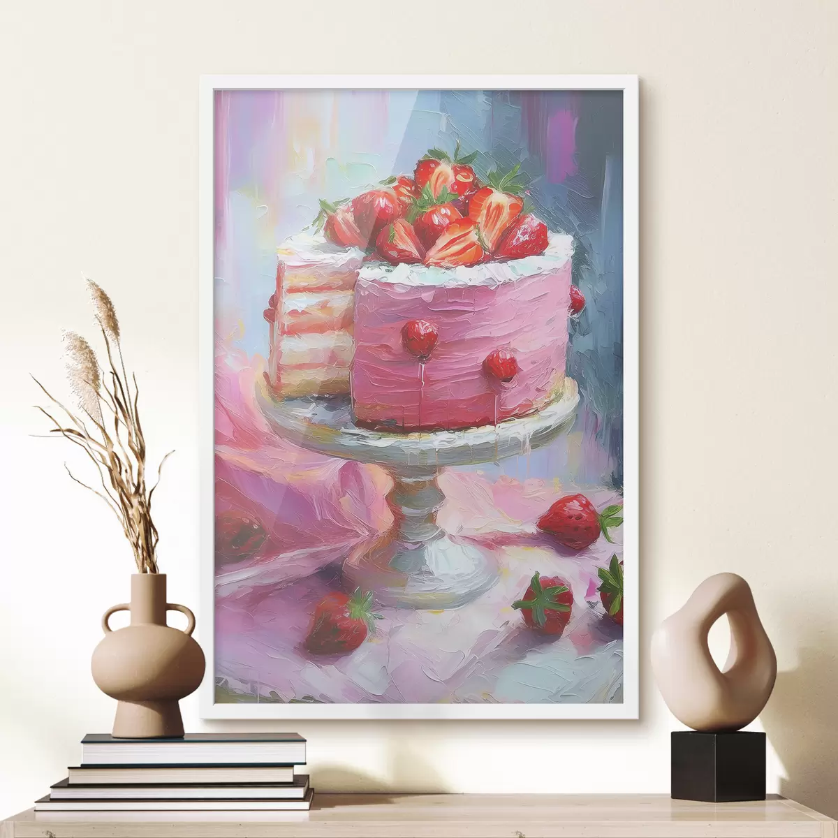 Poster Torta di fragole con crema, pittura ad olio, grandi pennellate, bacche estive, colori rosa Nr f38499