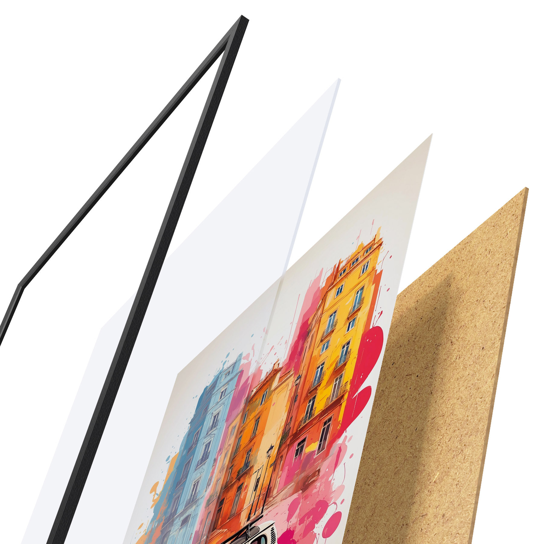 Il poster è composto da cornice, plexiglass, immagine stampata e supporto in truciolato. Il poster può essere immediatamente appeso alla parete grazie ai supporti sul retro.