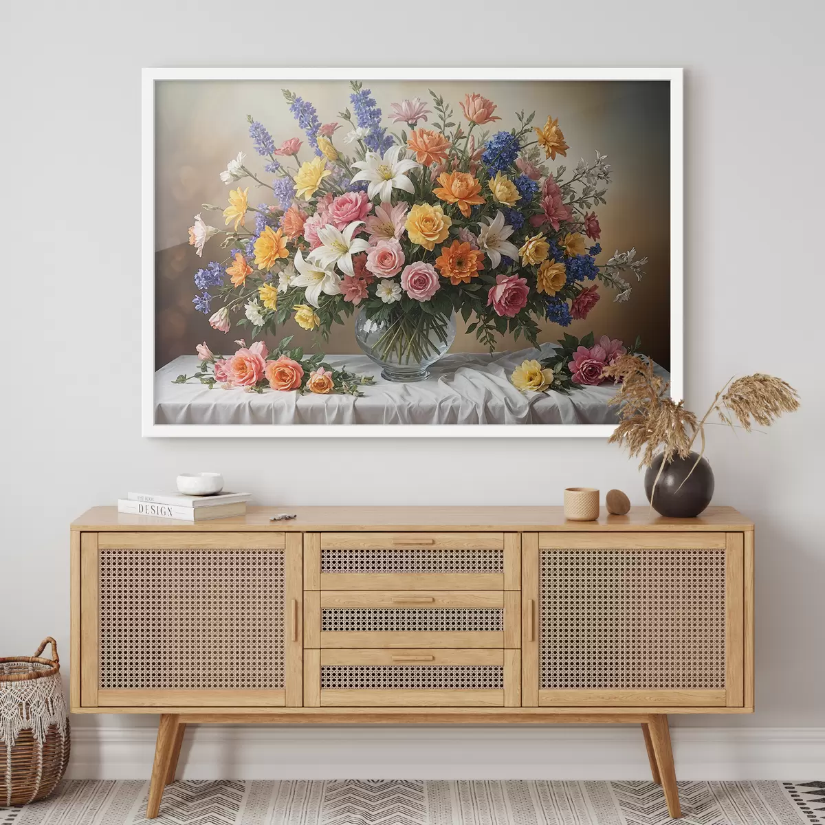 Poster Un vivace bouquet di vari fiori colorati in un vaso di vetro su una tovaglia bianca dipinta d'arte vintage f38825