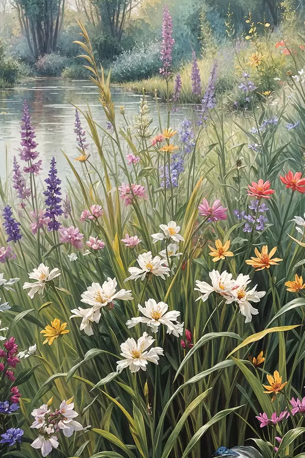 Poster Fiori di campo ed erbe alte. La scena complessiva raffigura un paesaggio naturale vibrante Nr f38829