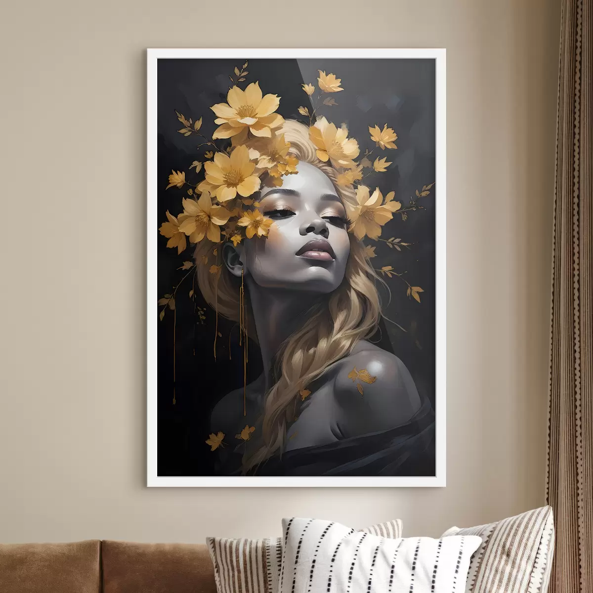 Poster Un ritratto di giovane donna circondata da foglie autunnali giallo su uno sfondo scuro f38834
