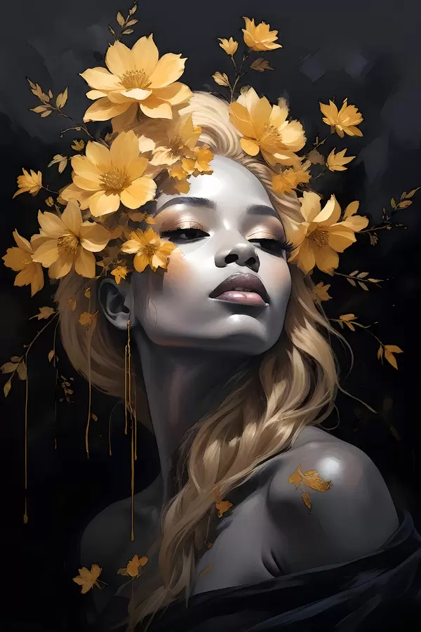 Poster Un ritratto di giovane donna circondata da foglie autunnali giallo su uno sfondo scuro Nr f38834