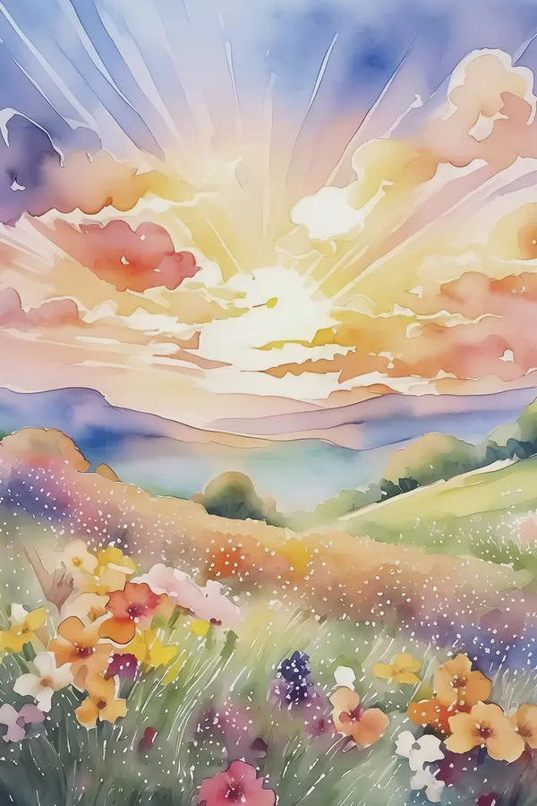 Poster Tramonto nel campo estivo, fiori, sole, cielo colorato, nuvole, natura Nr f38842