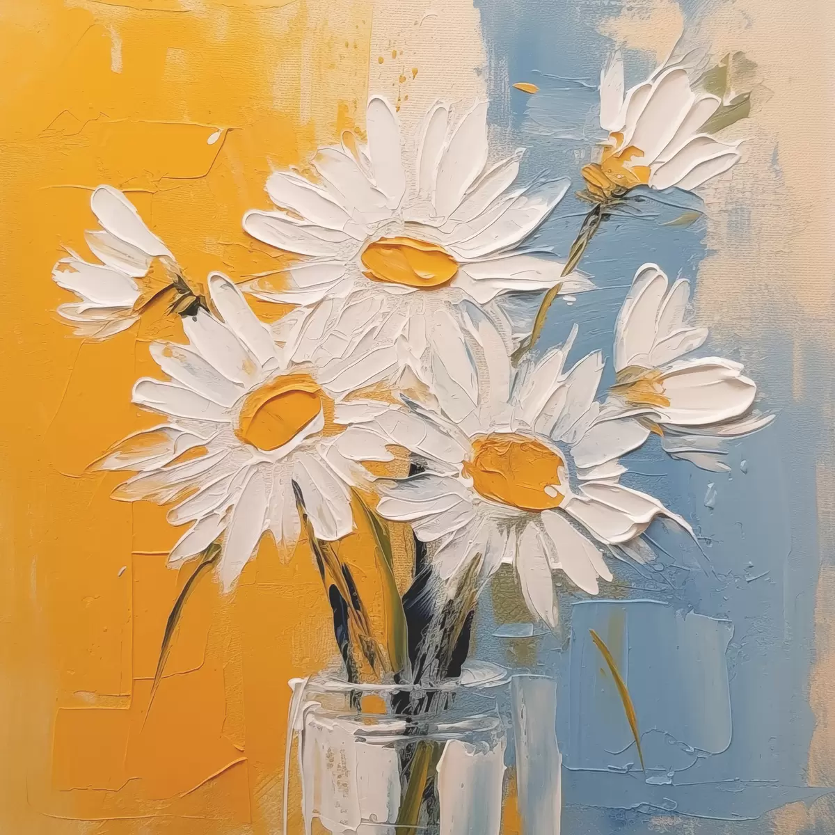 Poster Margherite bianche in un vaso di vetro su sfondo blu e giallo, imitazione della pittura a olio, tratti grandi f38907