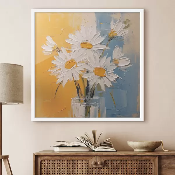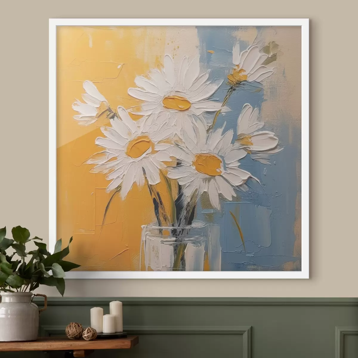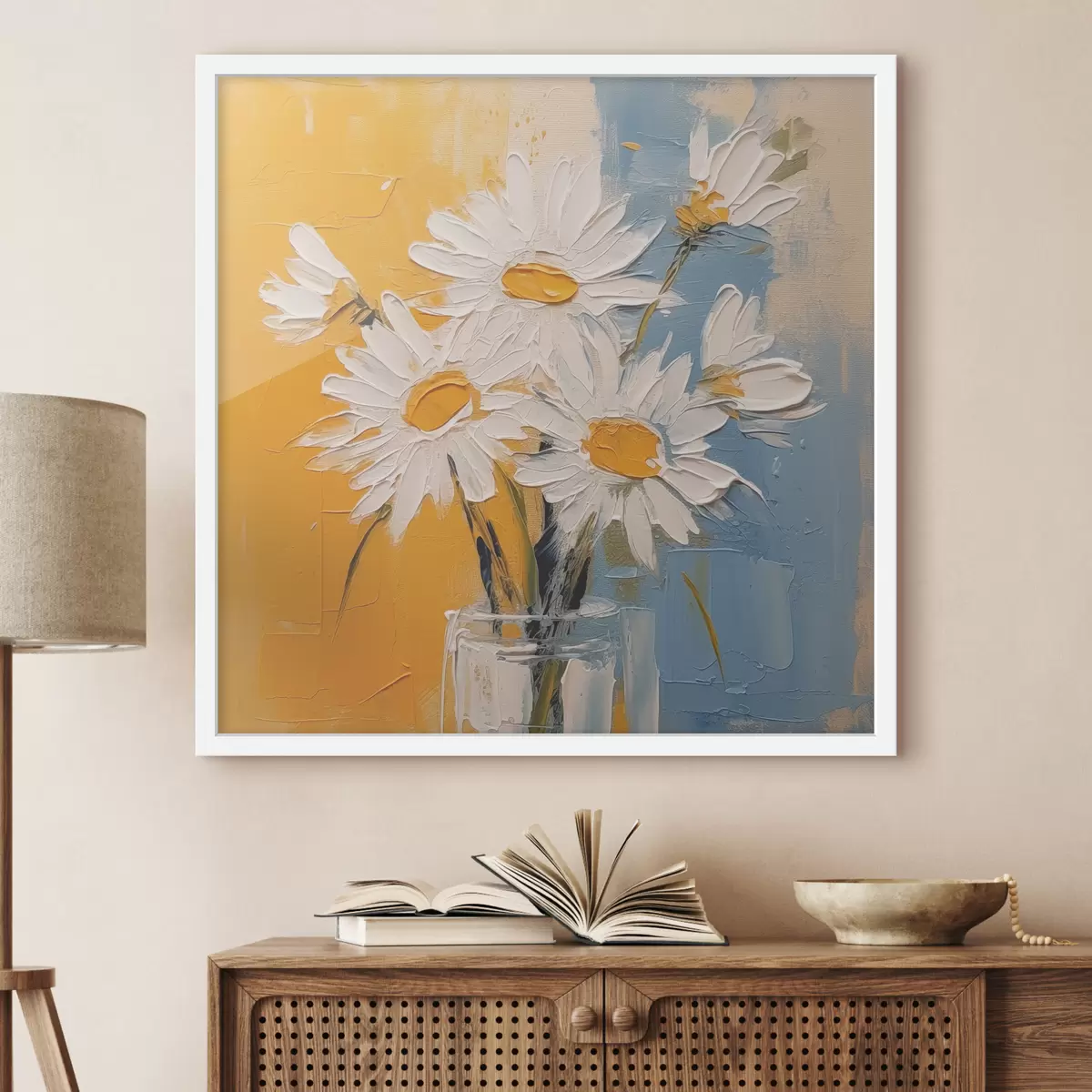 Poster Margherite bianche in un vaso di vetro su sfondo blu e giallo, imitazione della pittura a olio, tratti grandi Nr f38907