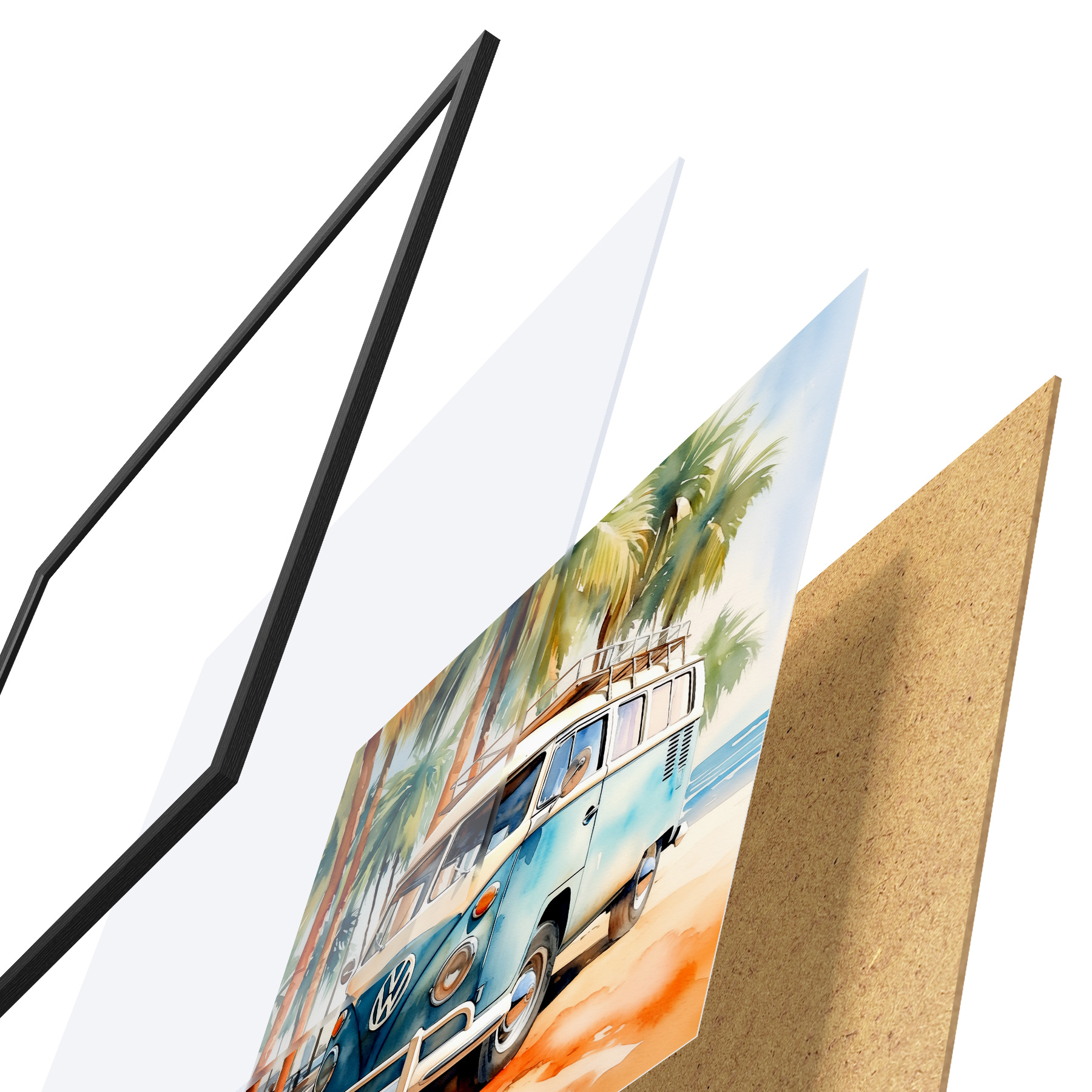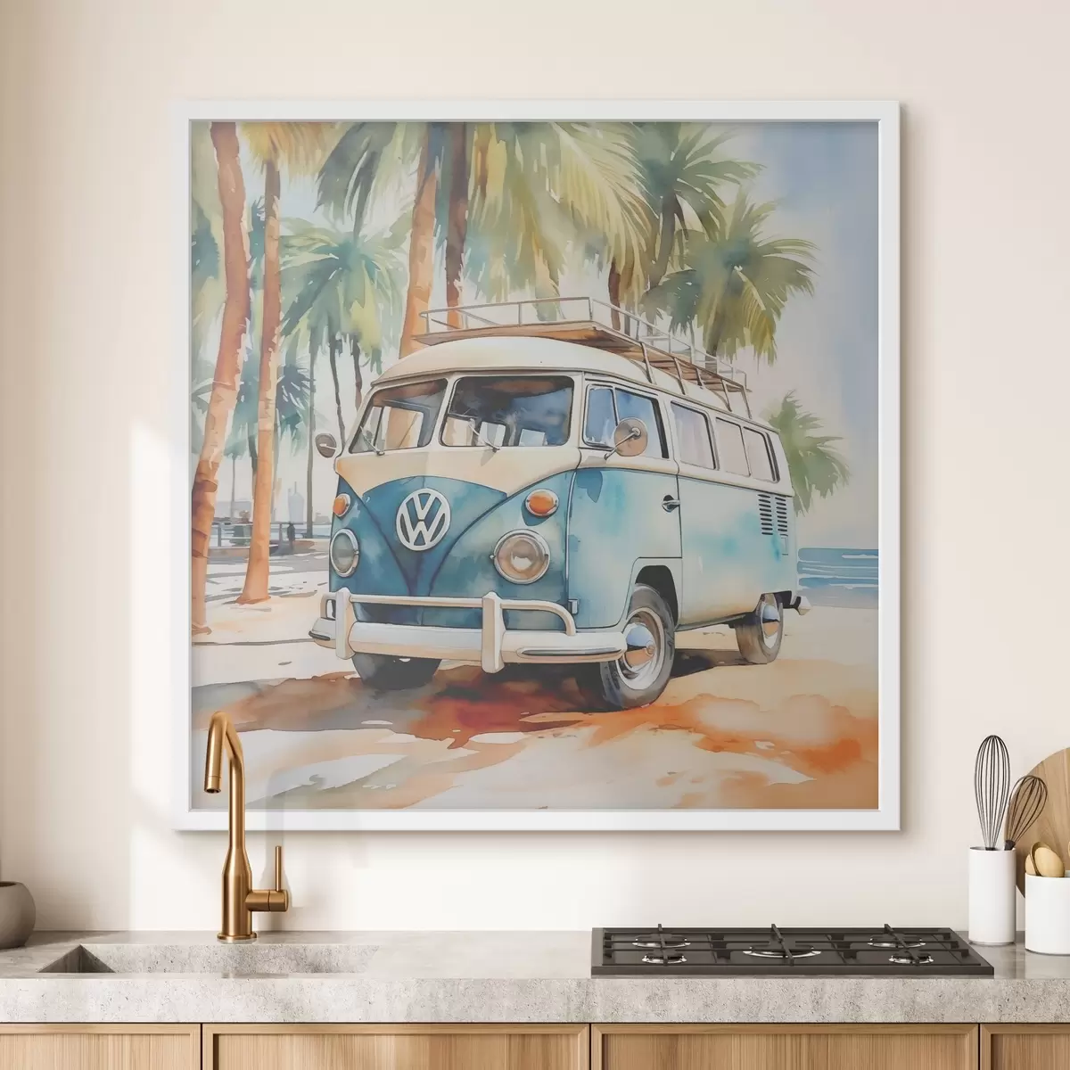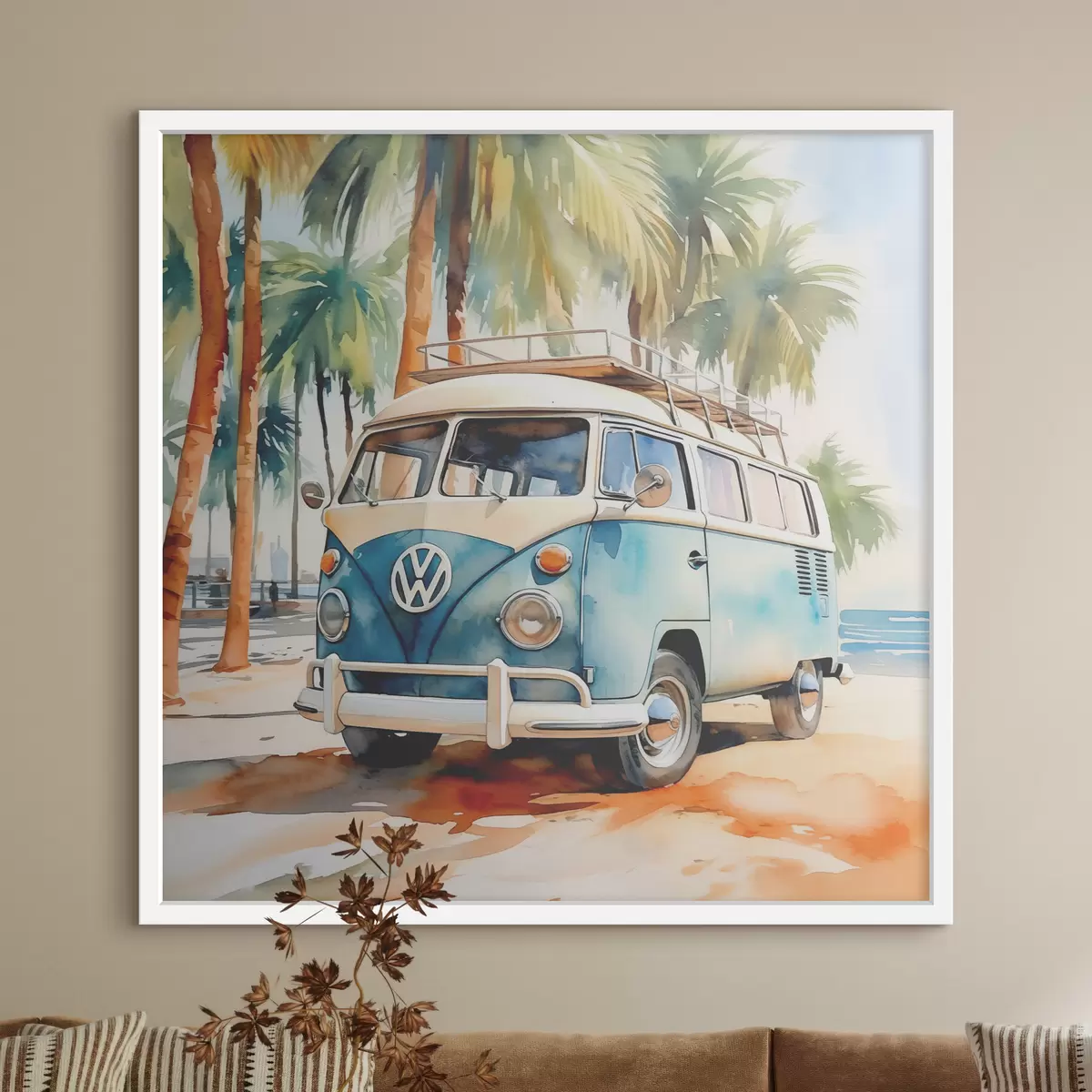 Poster Un'auto da viaggio è parcheggiata sulla spiaggia su uno sfondo di palme acquerellate Nr f38911