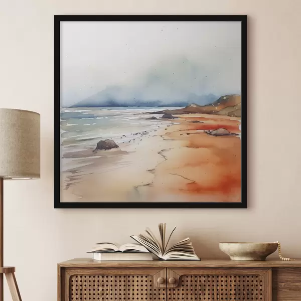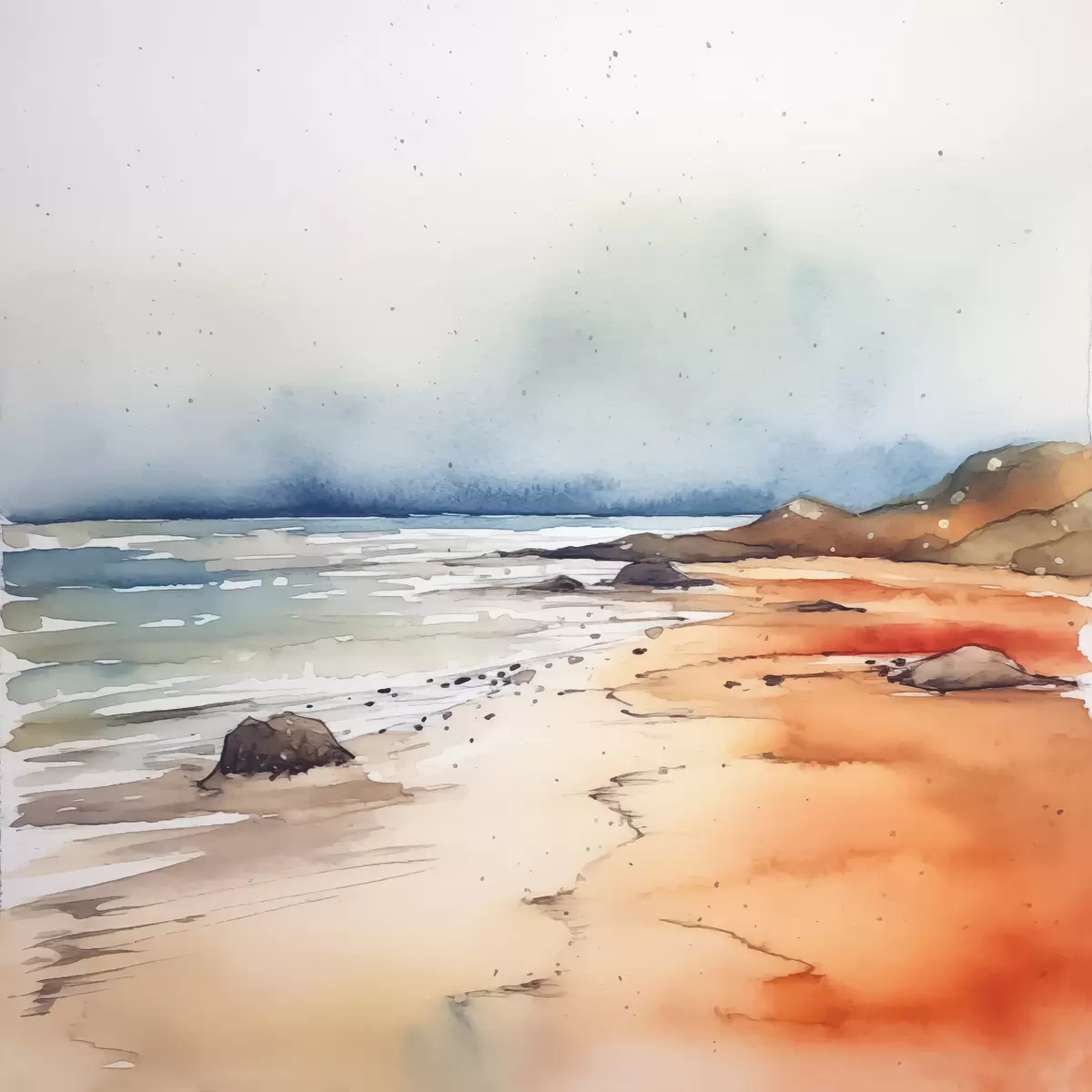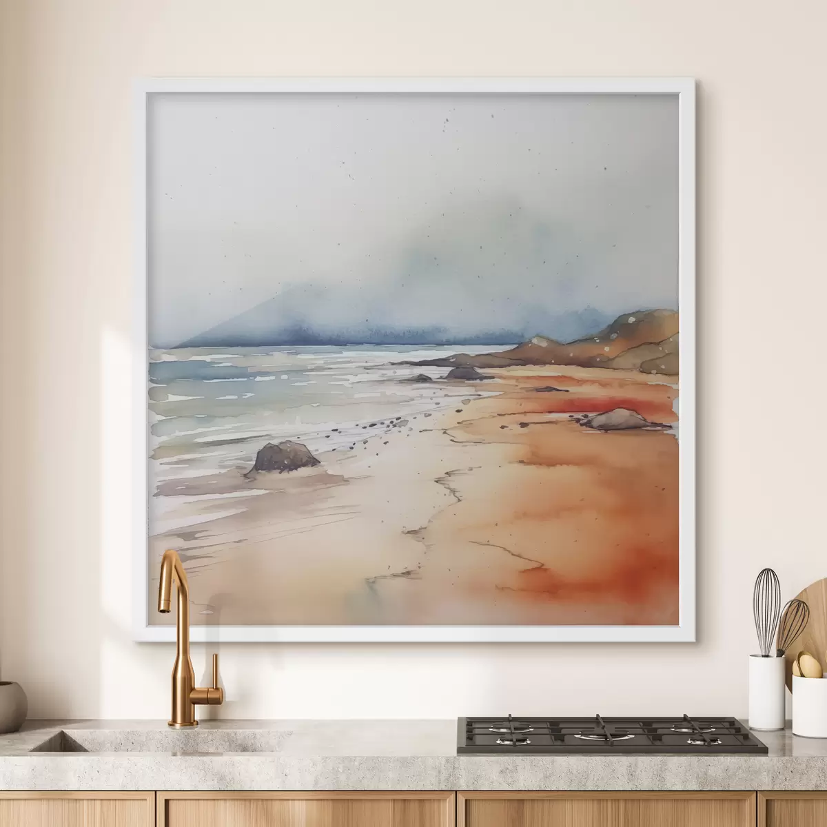 Poster Mare e spiaggia, pioggia, acquerello, macchie, paesaggio, paesaggio, blu, colore arancione Nr f38936