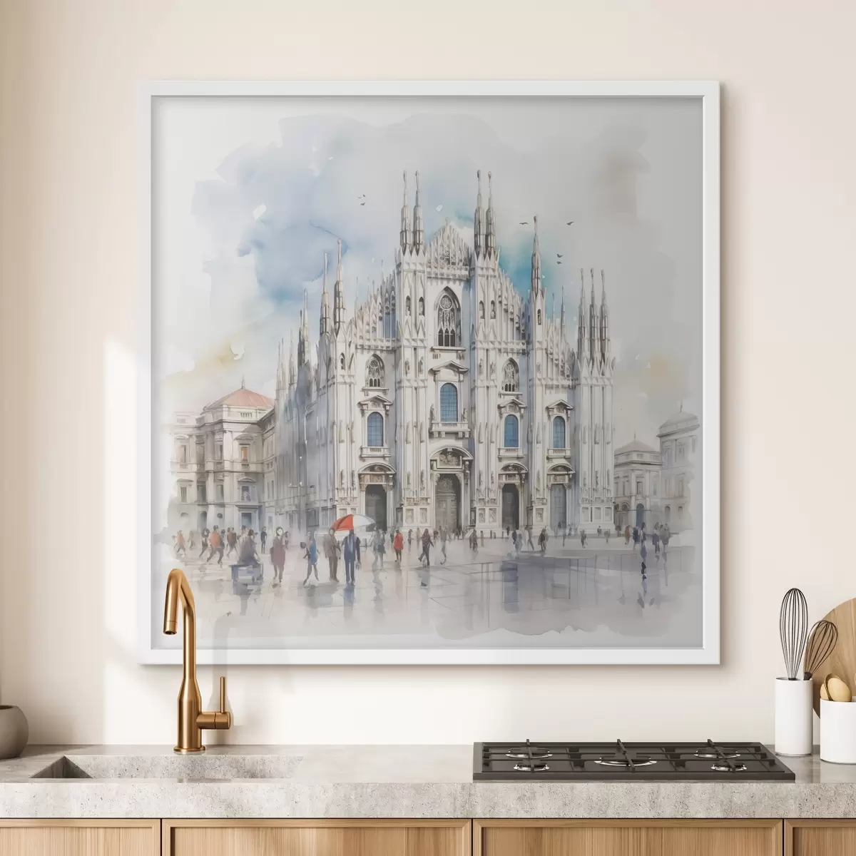 Poster Duomo di Milano, architettura, città, pioggia, acquerello, blu, grigio, persone che camminano Nr f38938