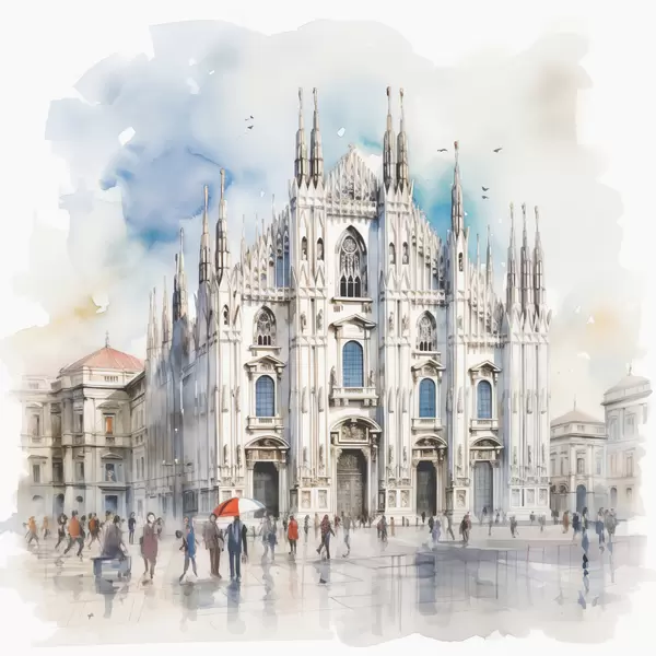 Poster Duomo di Milano, architettura, città, pioggia, acquerello, blu, grigio, persone che camminano Nr f38938