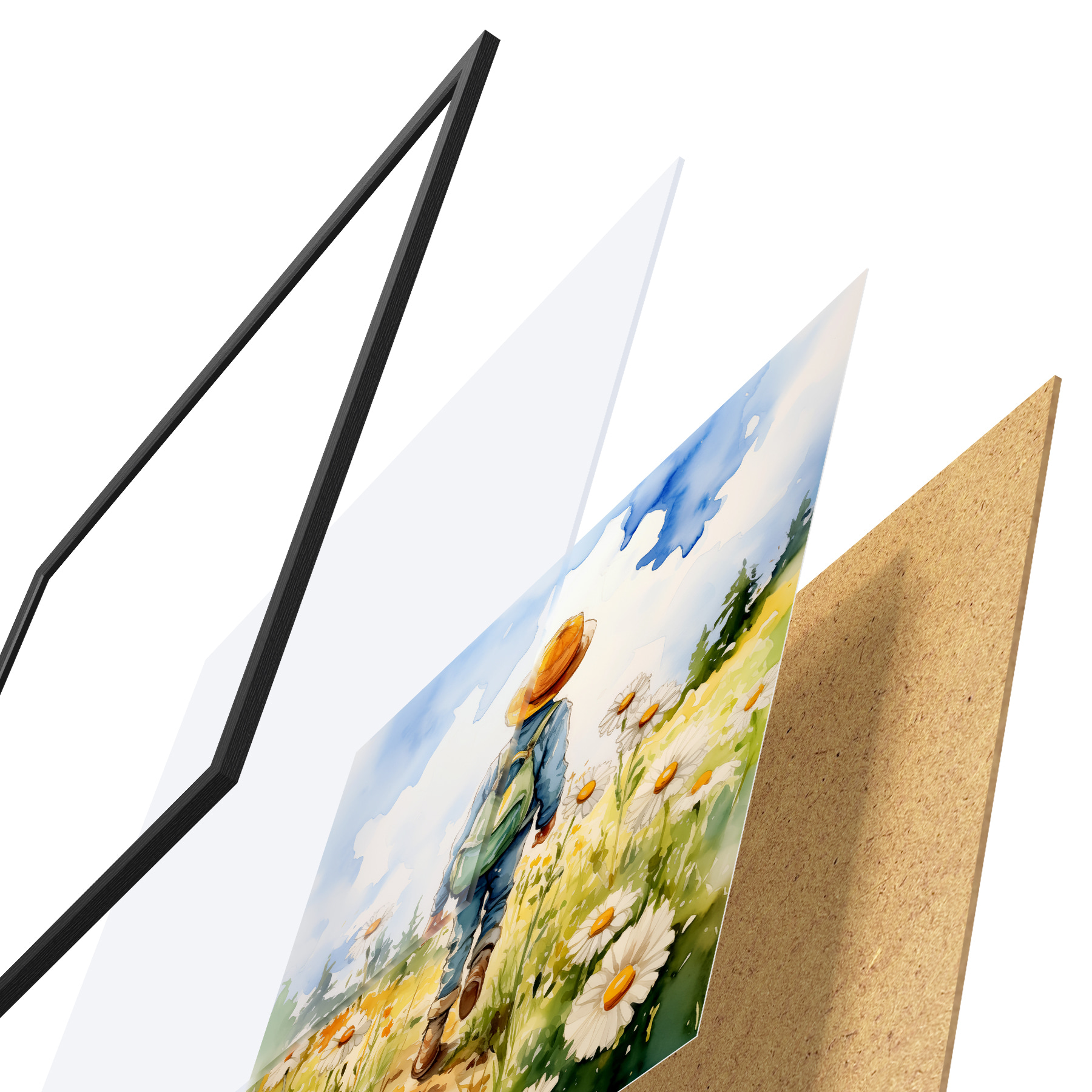 Poster Un ragazzo con un cappello da cowboy con uno zaino verde dietro la schiena e un abito blu cammina lungo un sentiero in un campo di camomilla, acquerello Nr f38946