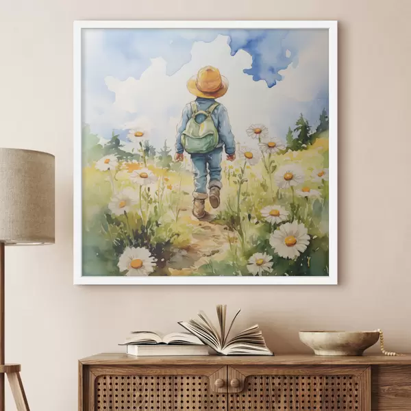 Poster Un ragazzo con un cappello da cowboy con uno zaino verde dietro la schiena e un abito blu cammina lungo un sentiero in un campo di camomilla, acquerello f38946