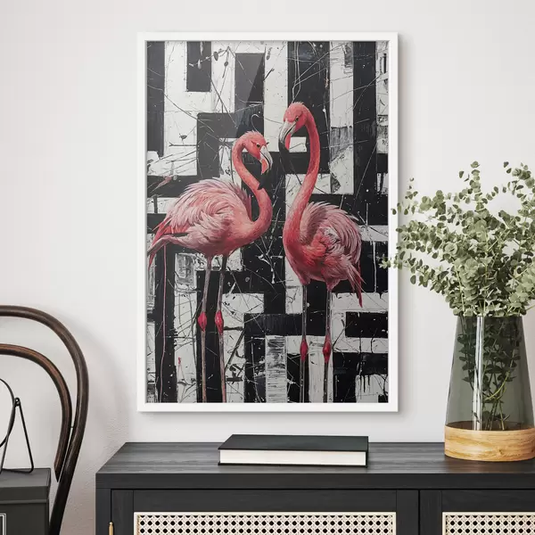 Poster Due fenicotteri rosa in piedi davanti a un dipinto artistico di sfondo astratto bianco e nero Nr f38954