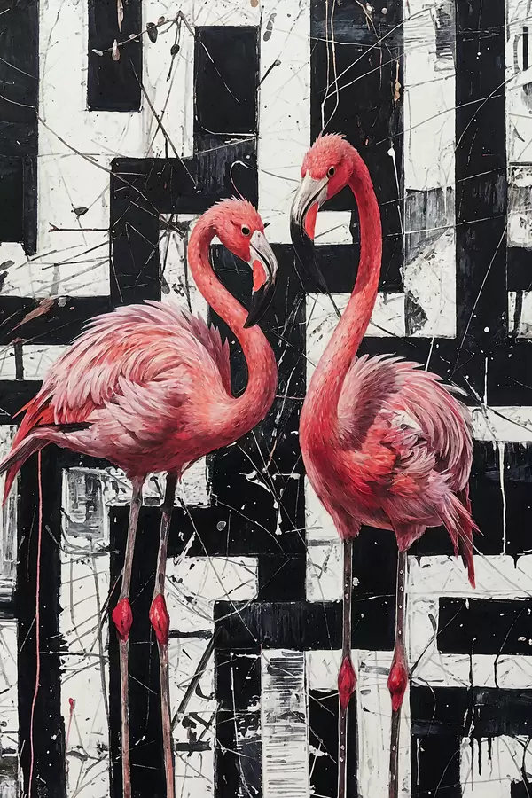 Poster Due fenicotteri rosa in piedi davanti a un dipinto artistico di sfondo astratto bianco e nero Nr f38954