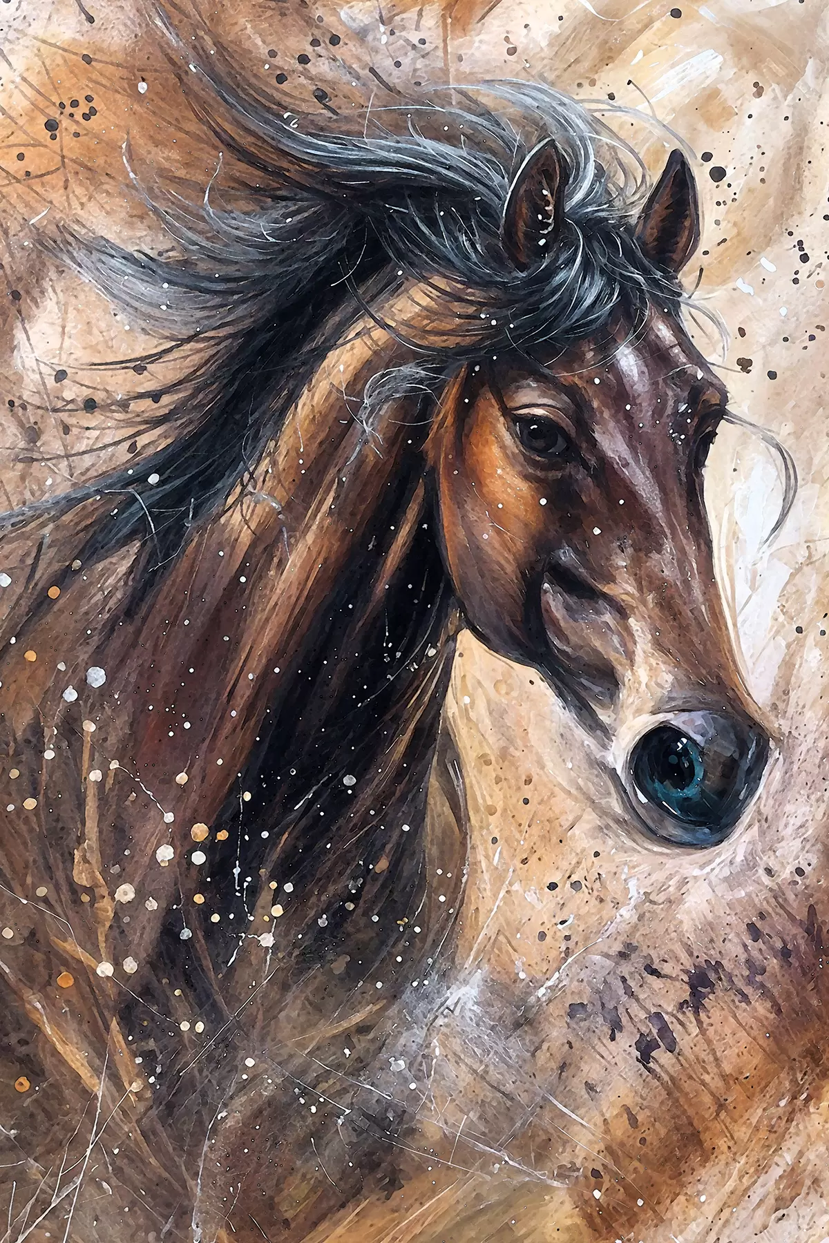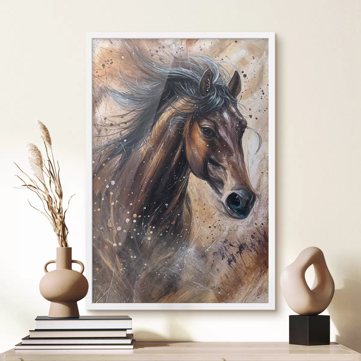 Poster Dipinto di un cavallo marrone con una criniera fluente, su uno sfondo strutturato con tocchi di colore Nr f38959