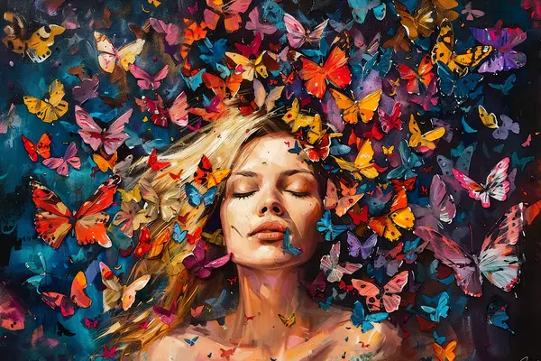 Poster Dipinto ad olio raffigurante una giovane donna circondata da uno sciame di farfalle colorate su uno sfondo scuro Nr f38972