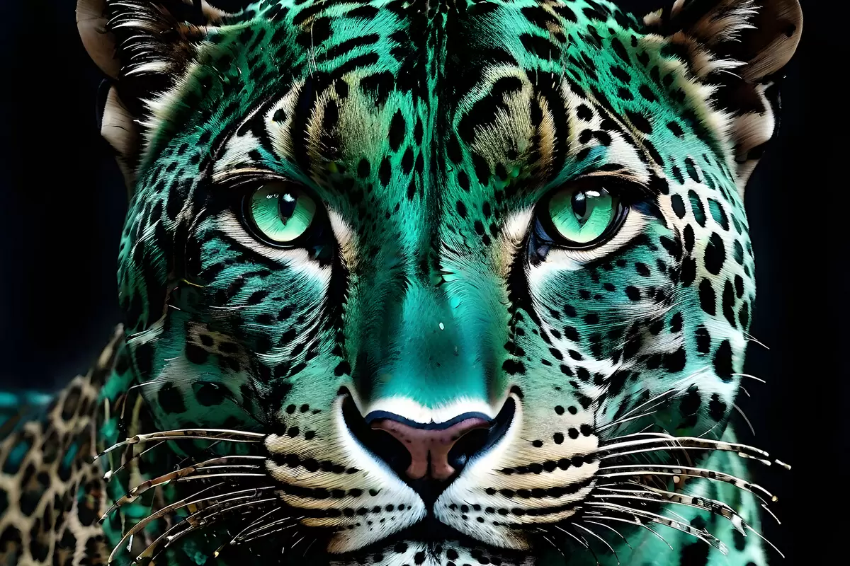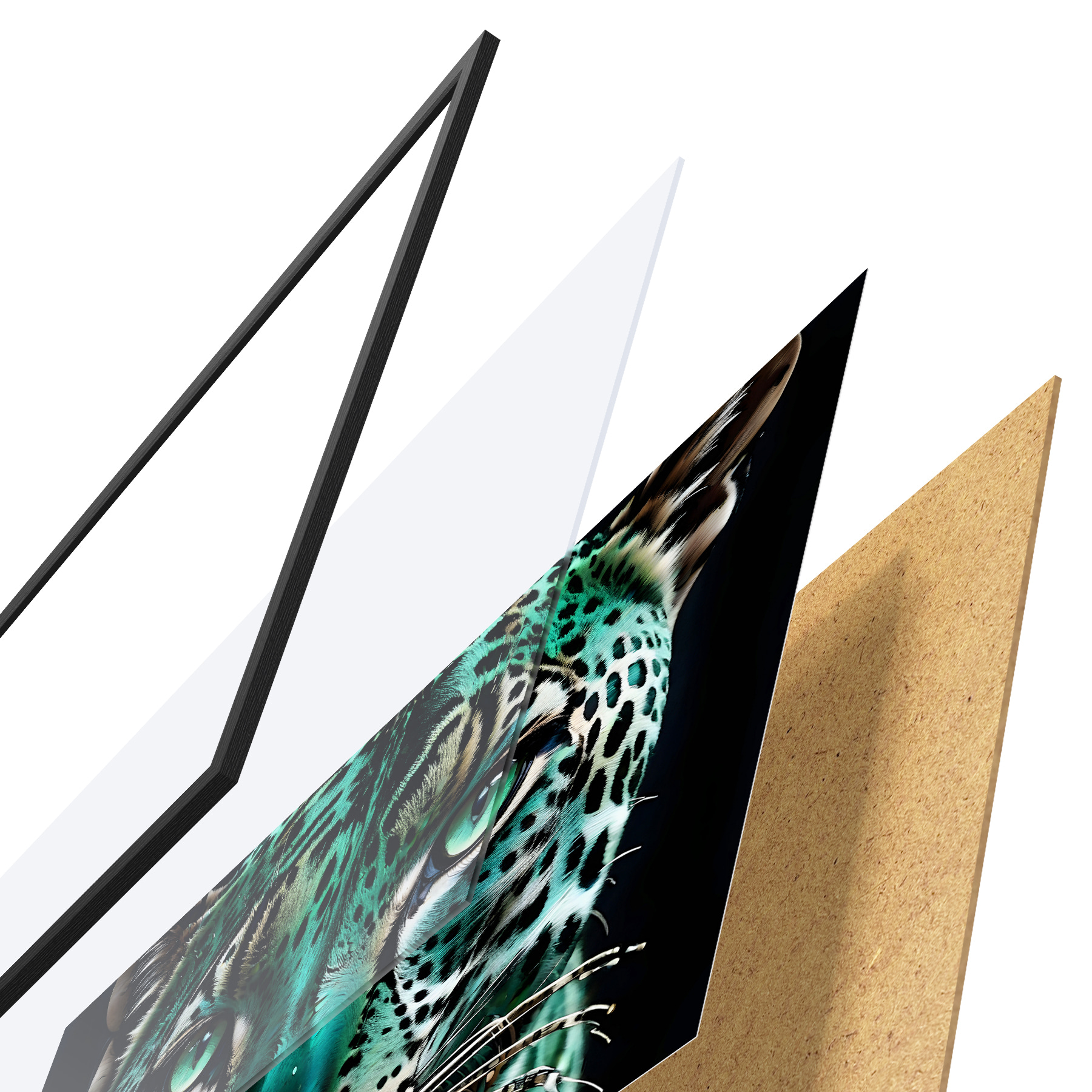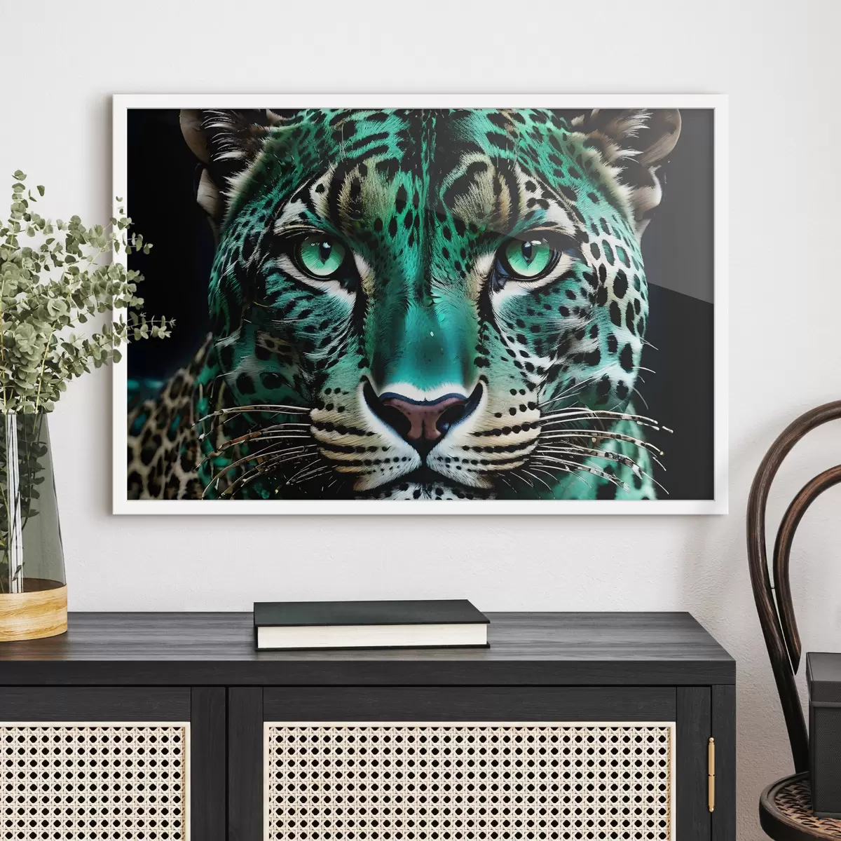 Poster Un ritratto ravvicinato di un feroce leopardo dagli occhi verdi con una vibrante pelliccia turchese e maculata nera Nr f38979