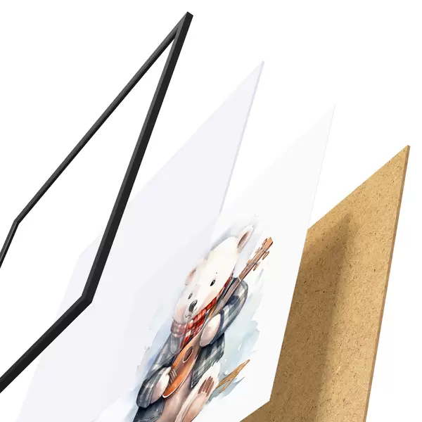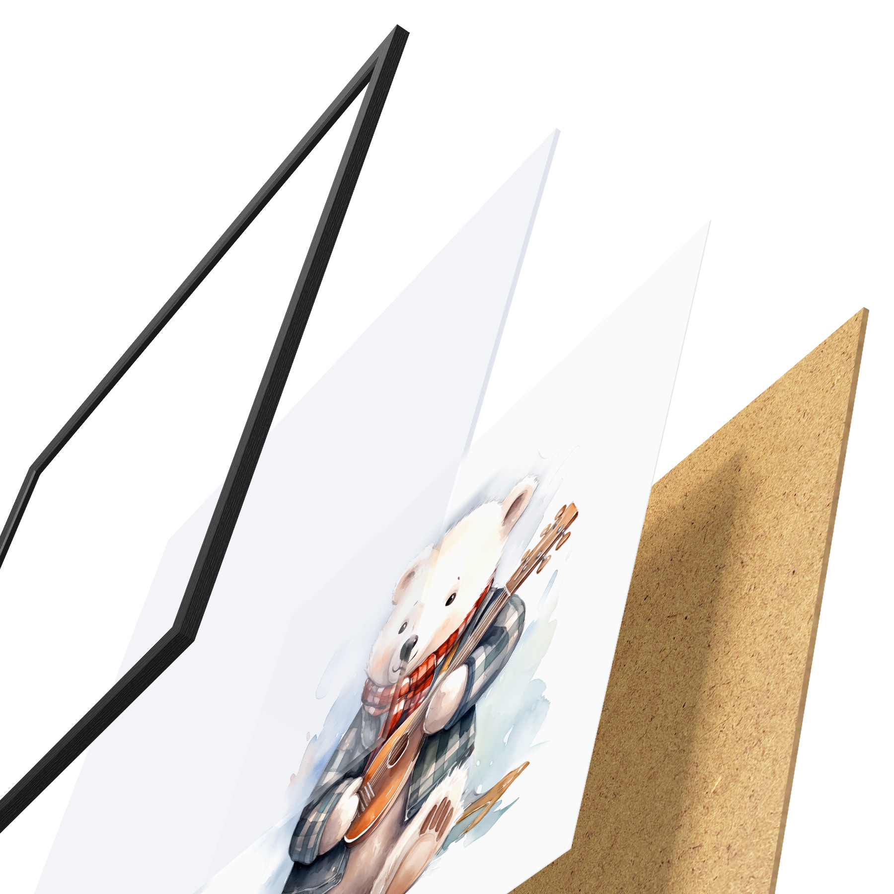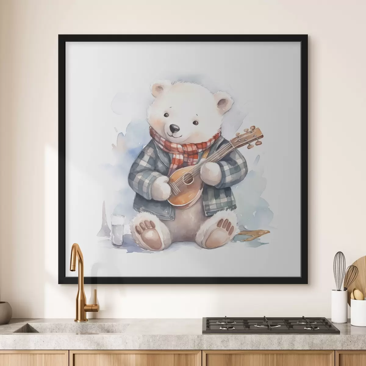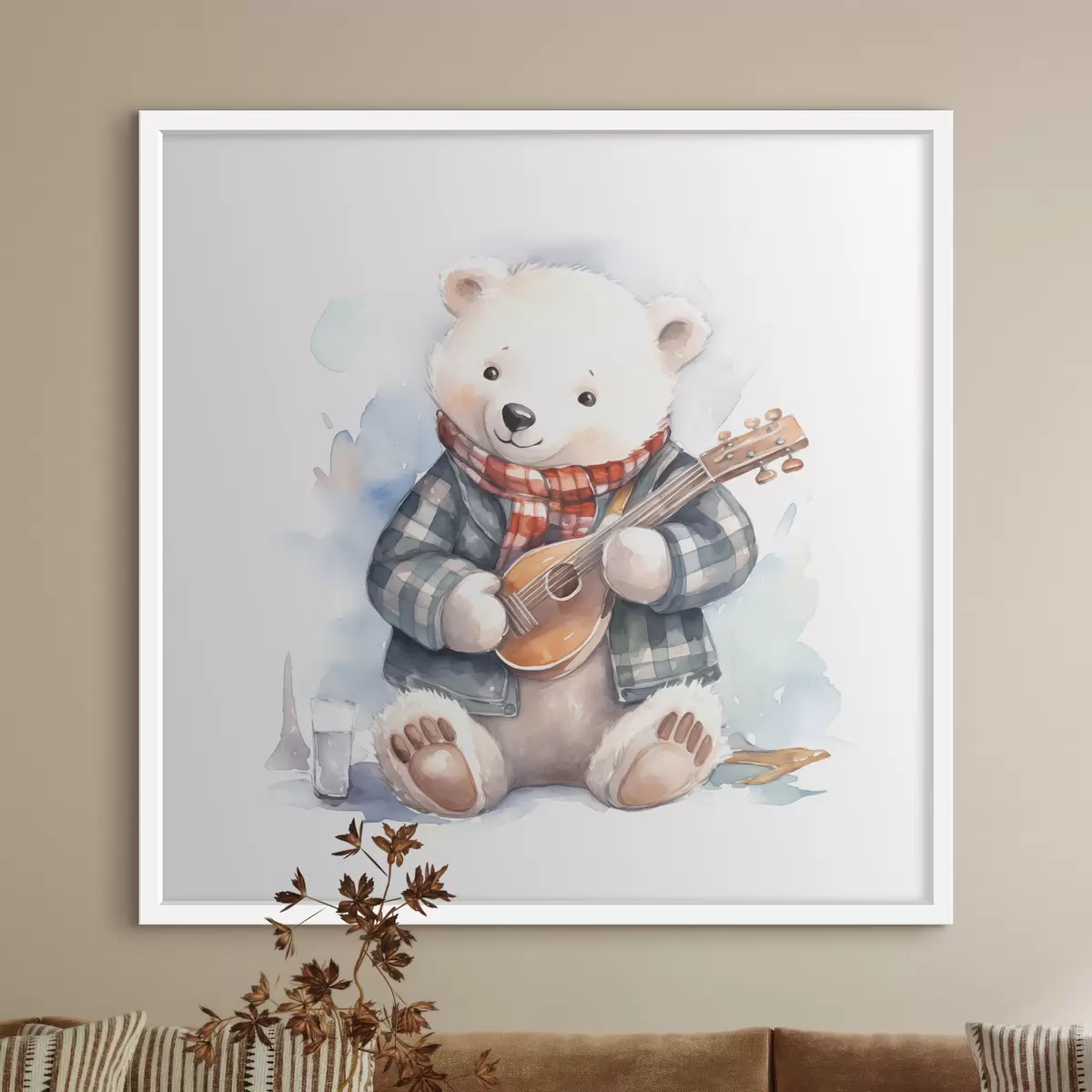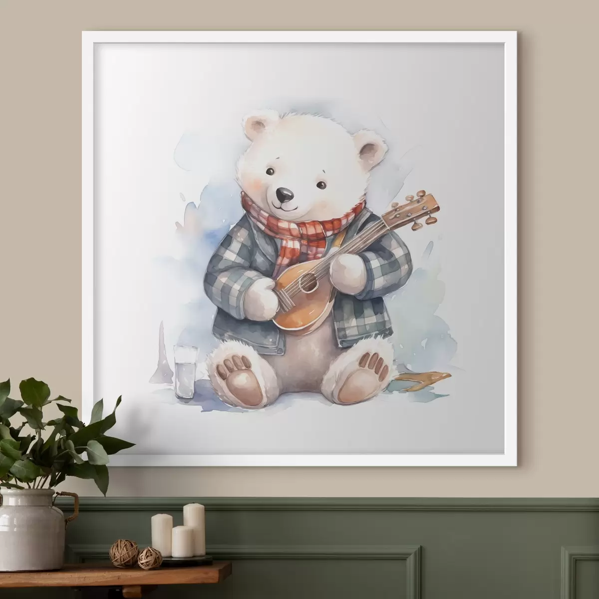 Poster Musicista orso polare in abito blu a scacchi e sciarpa rossa suona la chitarra illustrazione acquerello per bambini Nr f39120