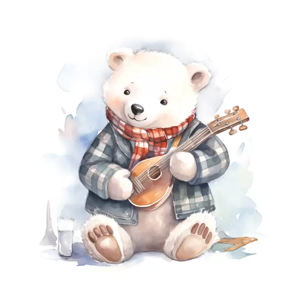 Poster Musicista orso polare in abito blu a scacchi e sciarpa rossa suona la chitarra illustrazione acquerello per bambini Nr f39120