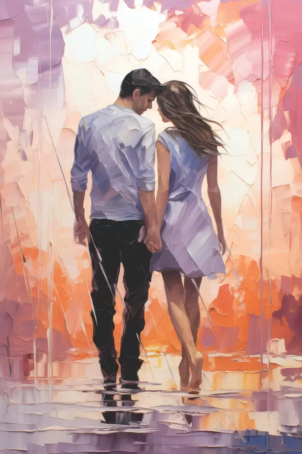 Poster Silhouette di una coppia innamorata pittura astratta, ragazza e ragazzo, colore rosa, arancione, viola, nero Nr f39124