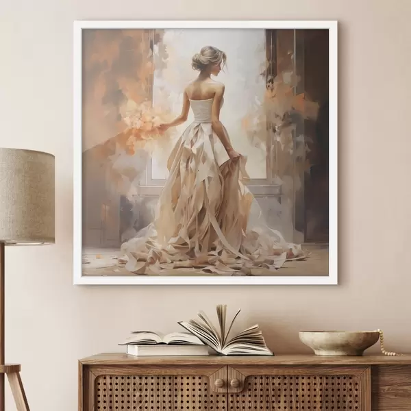 Poster Una ragazza in abito da sposa bianco si affaccia alla finestra tra i fuochi e dipinge a mano f39125