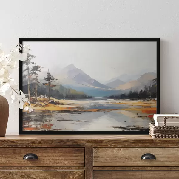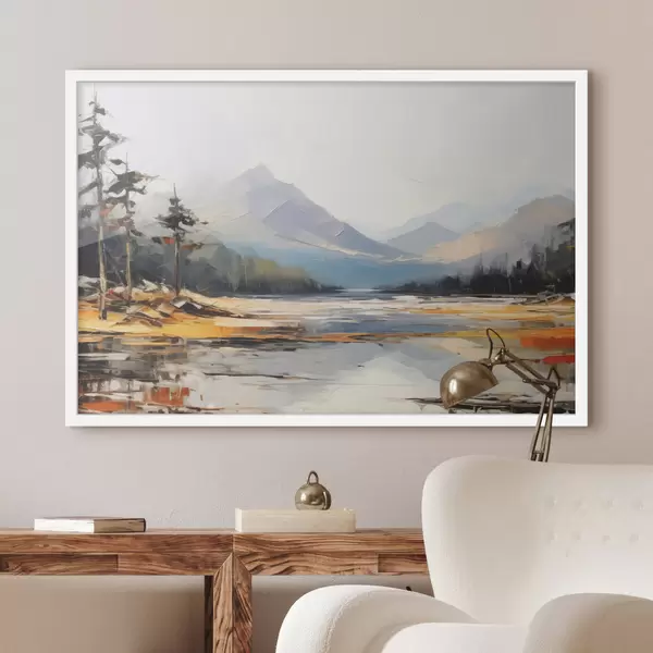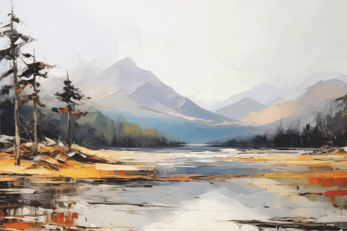Poster Catene montuose nella valle pittura a olio, paesaggio, natura, blu, colore giallo bianco Nr f39128