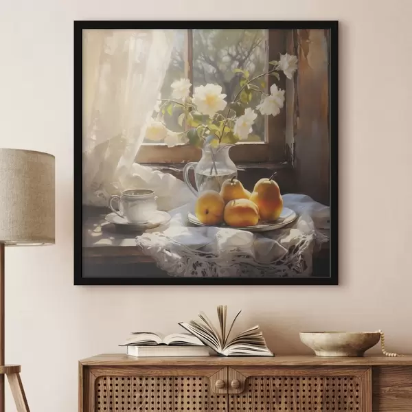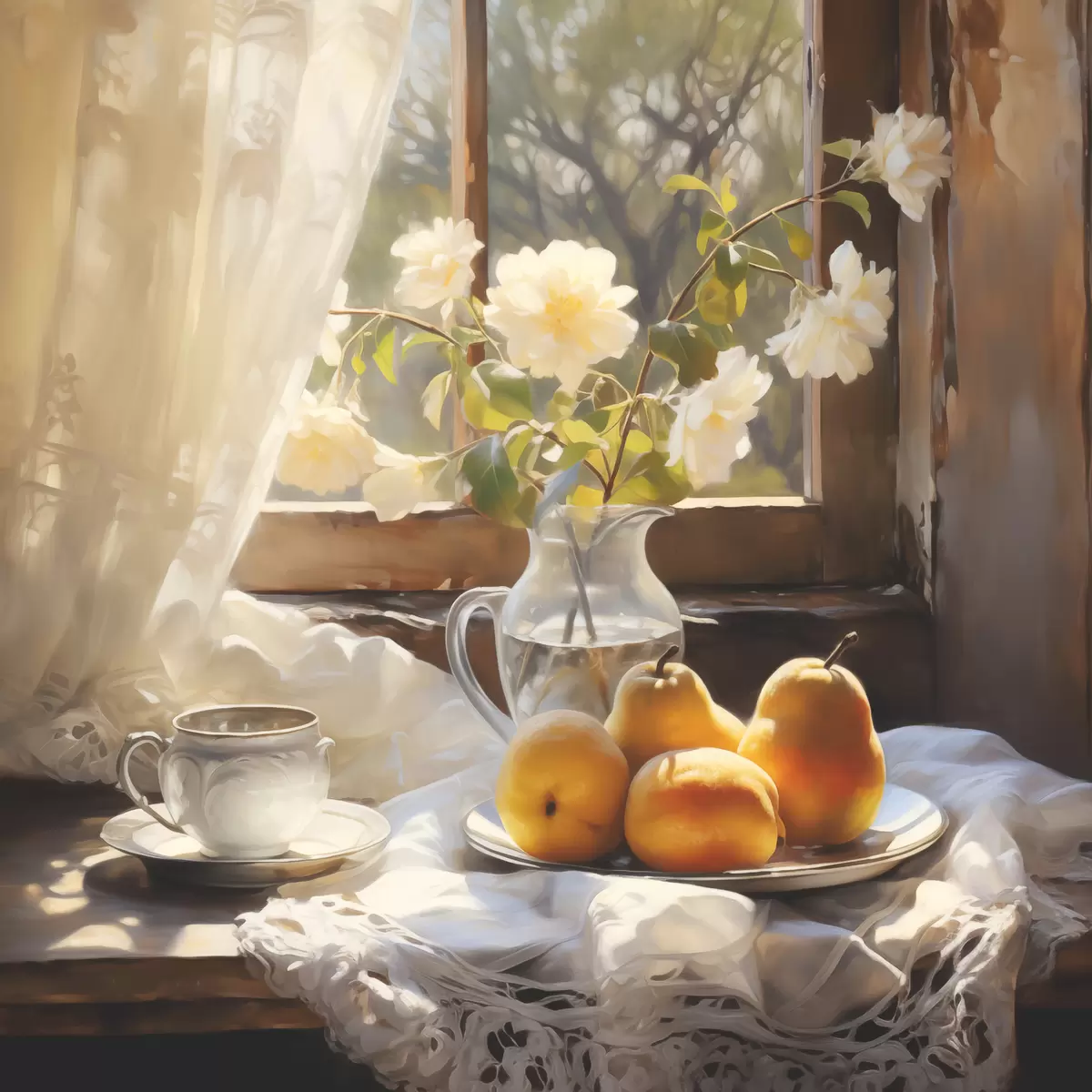Poster Natura morta rustica con pere gialle mature su un piatto su un tavolo vicino alla finestra, rose bianche in una brocca di vetro, tende di pizzo bianco f39129