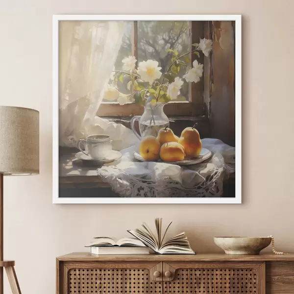 Poster Natura morta rustica con pere gialle mature su un piatto su un tavolo vicino alla finestra, rose bianche in una brocca di vetro, tende di pizzo bianco f39129