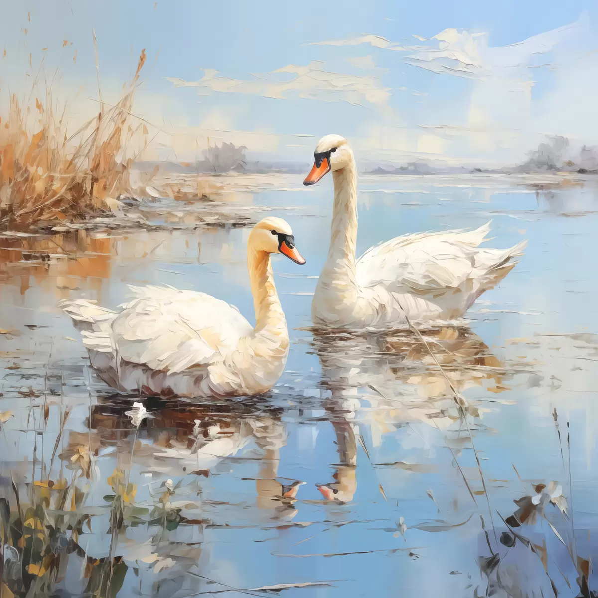 Poster Le oche bianche nuotano lungo il fiume tra i canneti, blu, bianche, beige Nr f39130