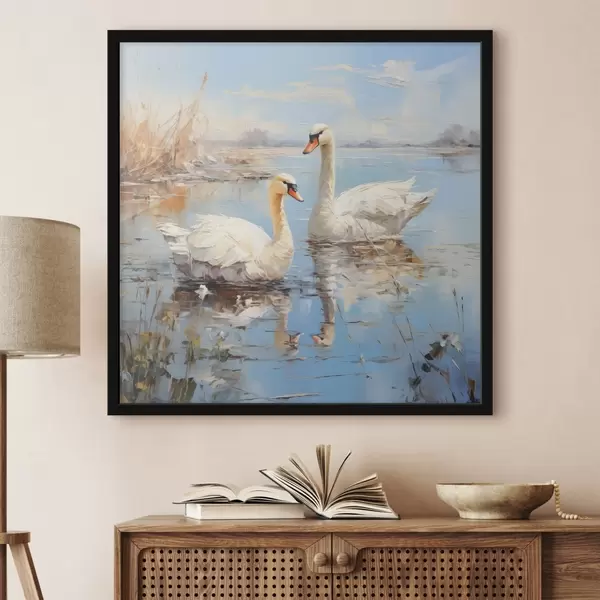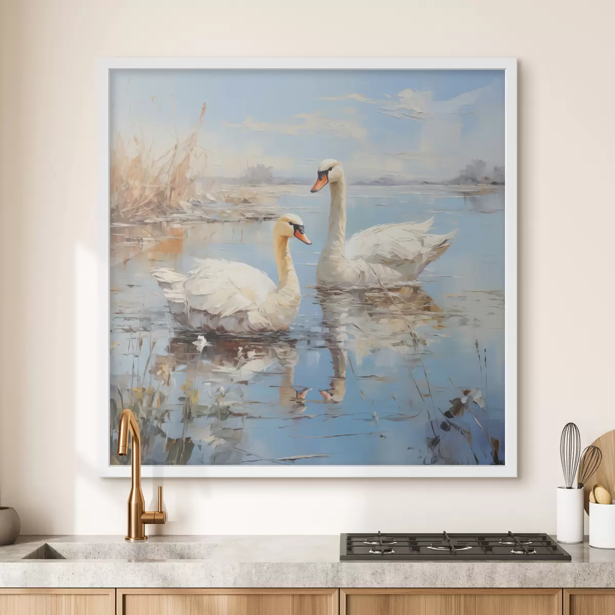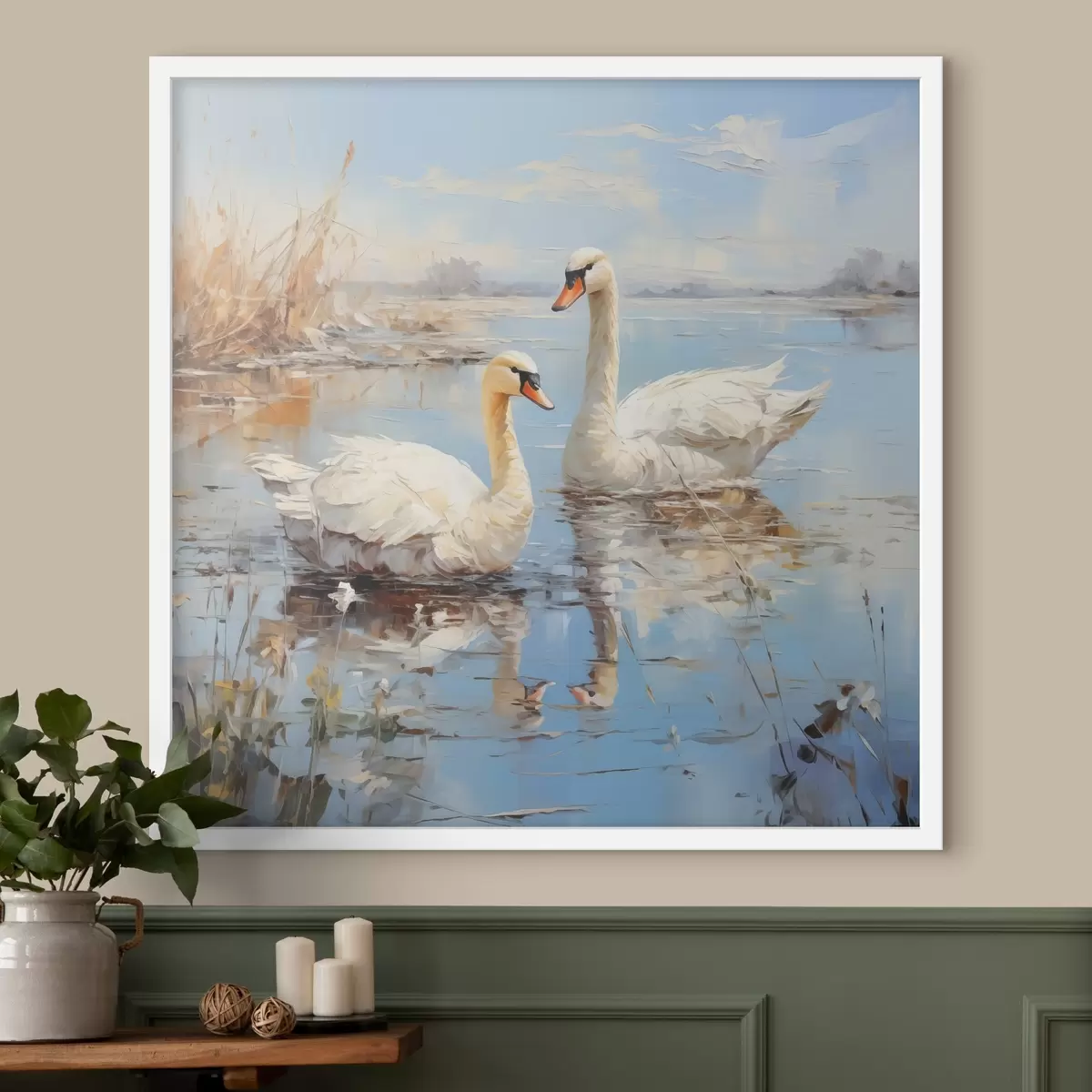 Poster Le oche bianche nuotano lungo il fiume tra i canneti, blu, bianche, beige f39130