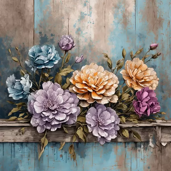 Poster Fiori e foglie sul vecchio ripiano in legno Nr f39169