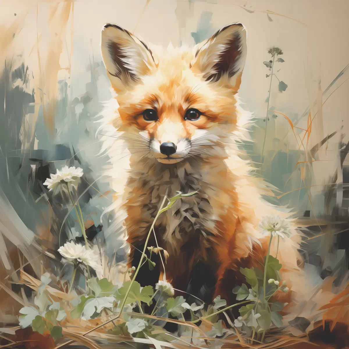 Poster Volpe rossa seduta nell'erba secca su uno sfondo verde. Pittura a olio Nr f39191