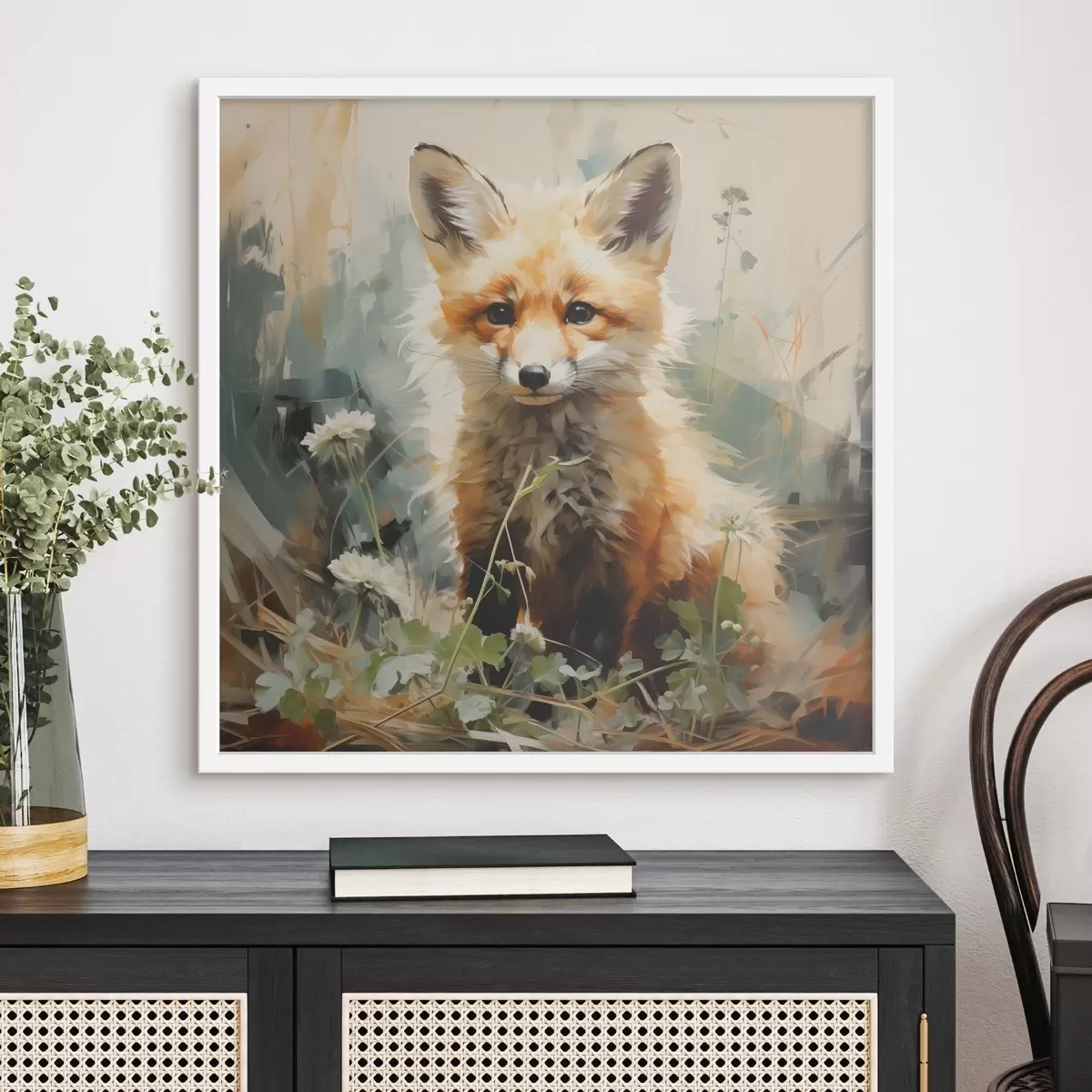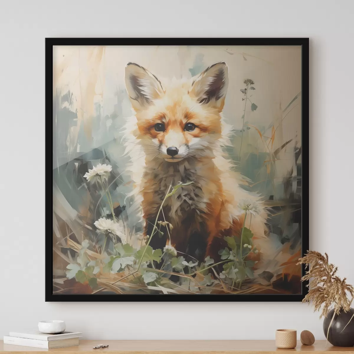 Poster Volpe rossa seduta nell'erba secca su uno sfondo verde. Pittura a olio f39191