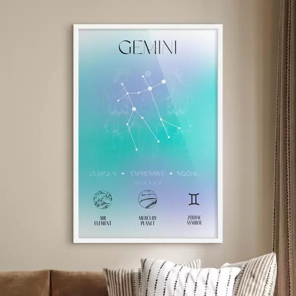 Poster Segno zodiacale Gemelli, costellazioni, cosmico, pianeti, astrologia, colori blu e viola Nr f39279