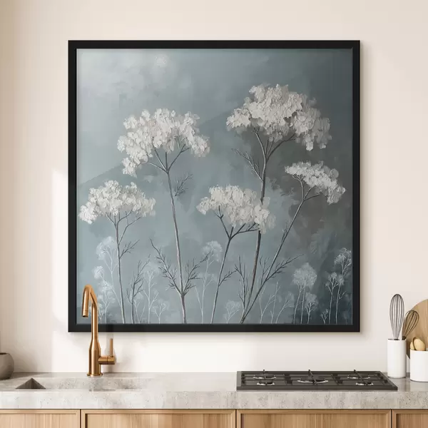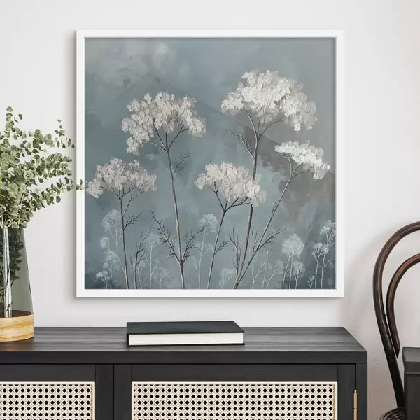 Poster un dipinto a olio raffigurante delicati fiori bianchi su sfondo blu f39325