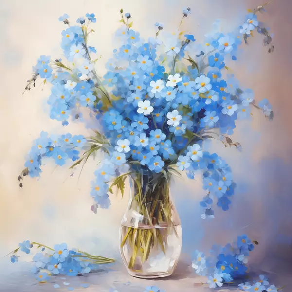 Poster Bouquet di fiori di campo blu in un dipinto a olio su caraffa di vetro Nr f39331