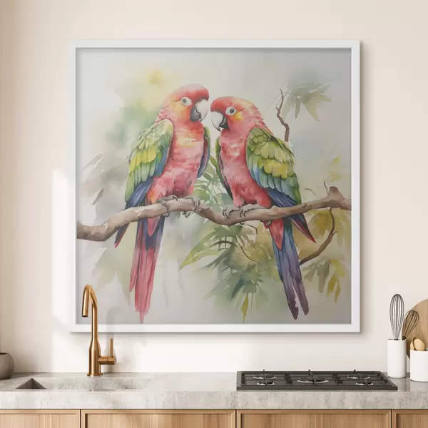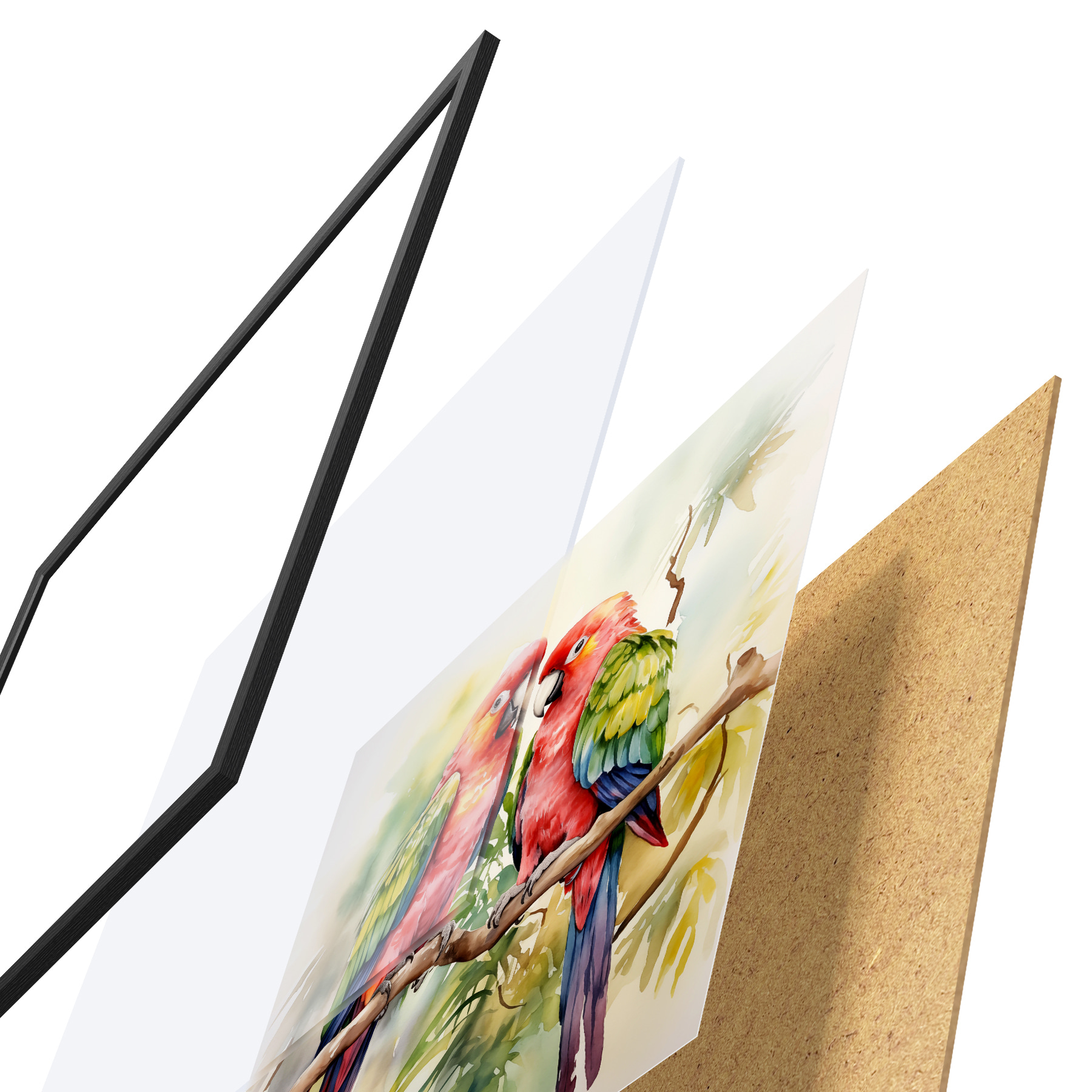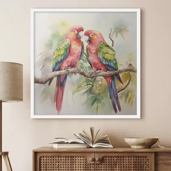 Poster Due pappagalli macaw luminosi seduti su un ramo dipinto ad acquerello Nr f39333