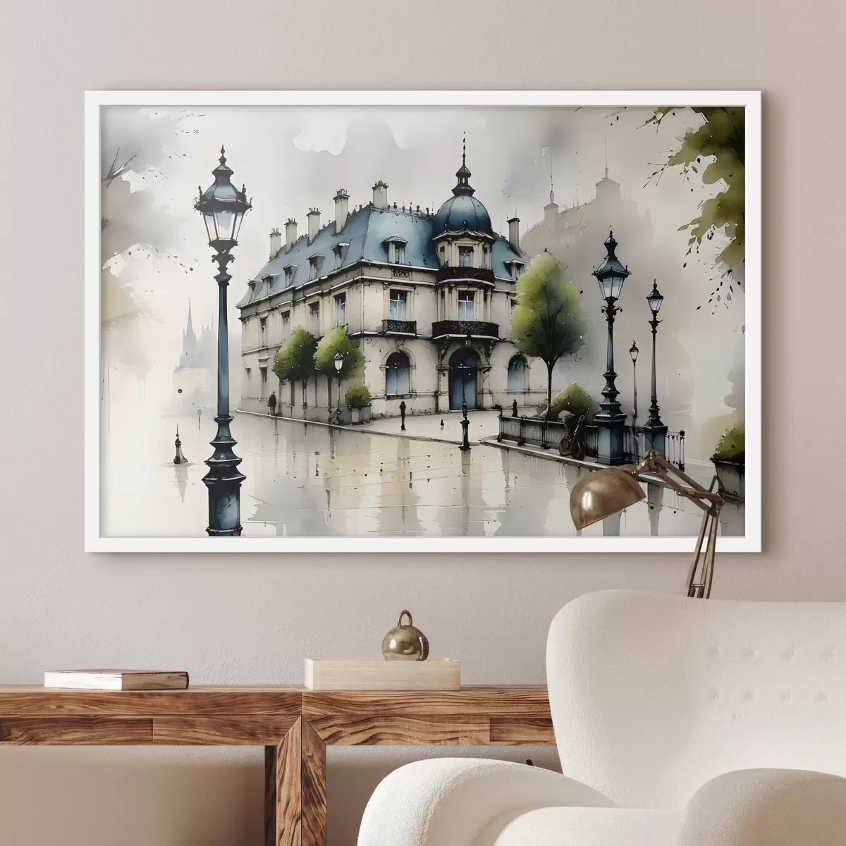 Poster Un grande edificio ad acquerello circondato da lampioni e alberi, in una giornata piovosa Nr f39391