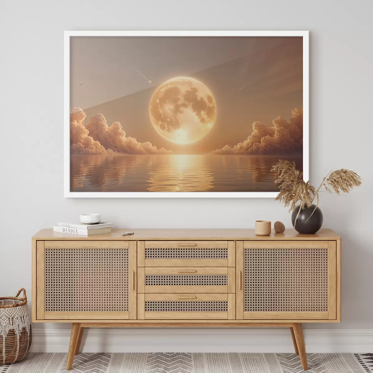 Poster Una luna piena grande e luminosa che sorge su un oceano calmo e riflettente al tramonto Nr f39403
