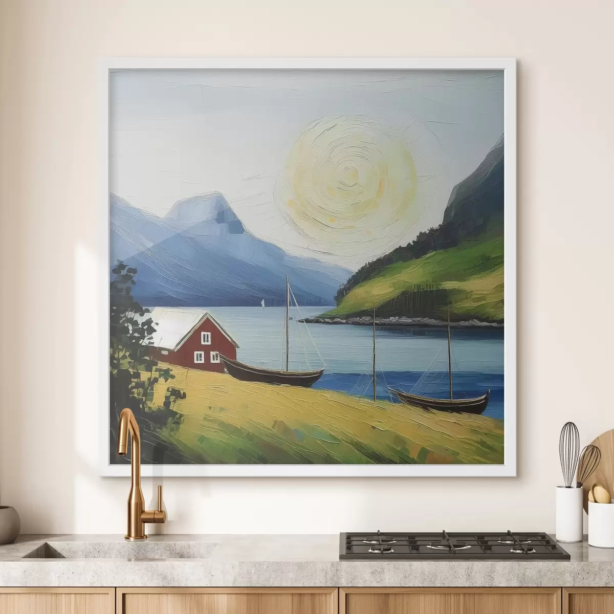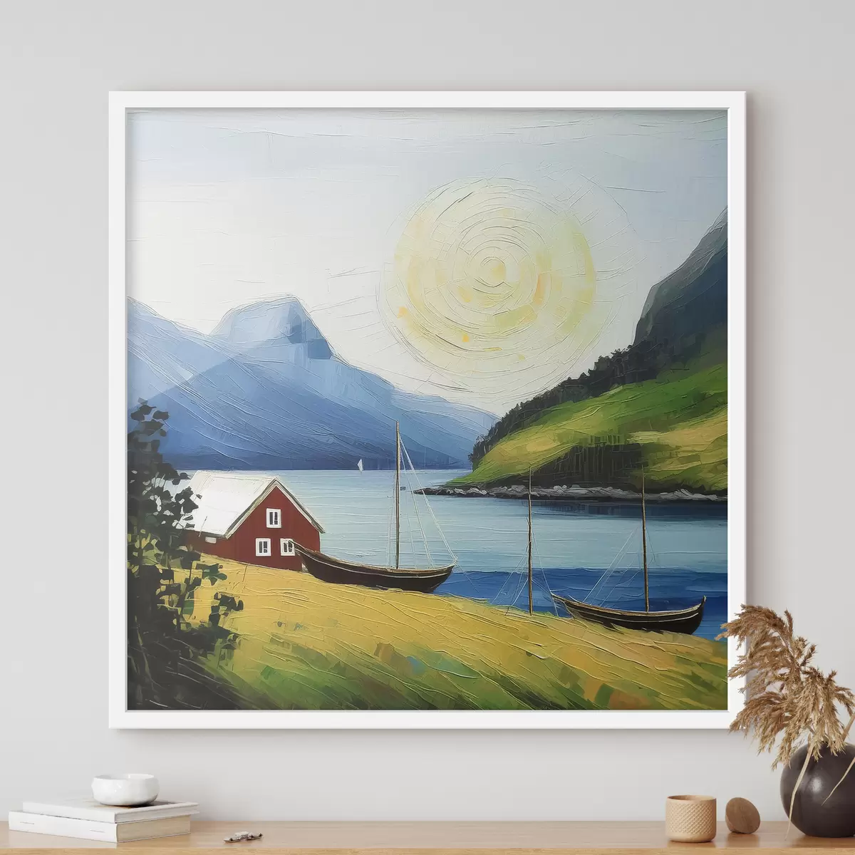 Poster Estate nordica, piccola casa sulla costa del mare, sole nel cielo blu, montagne f39423