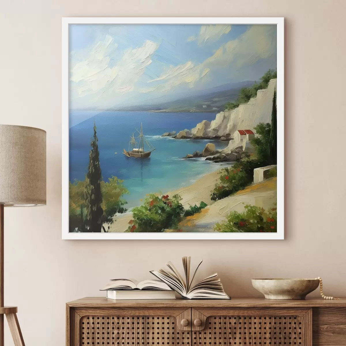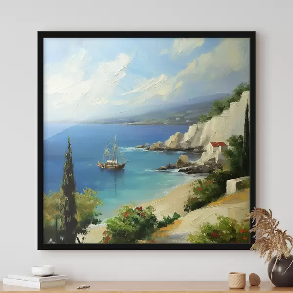 Poster Costa del mare della Grecia, nave, acqua blu, pittura a olio, natura estiva, rocce, pennellate vivaci Nr f39425