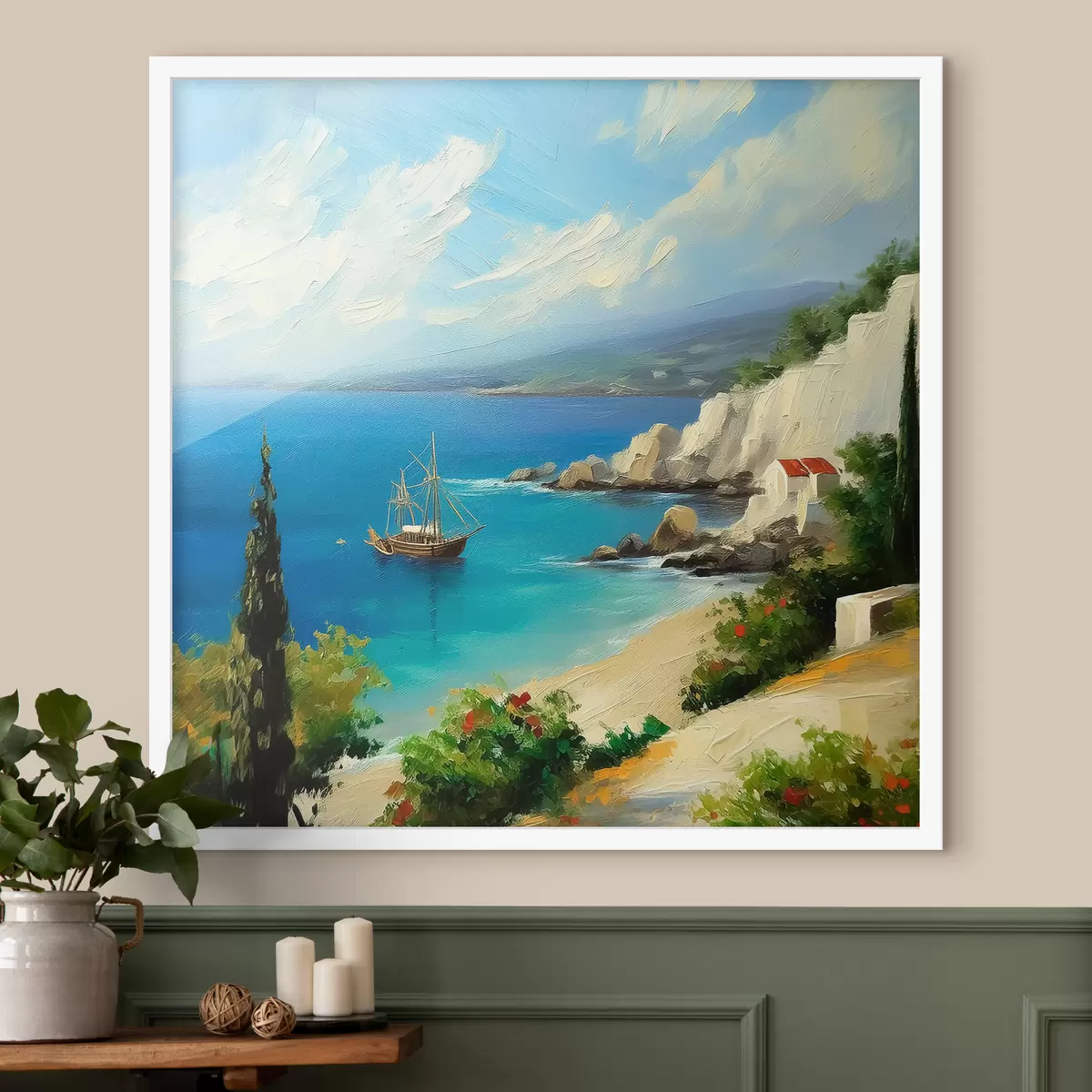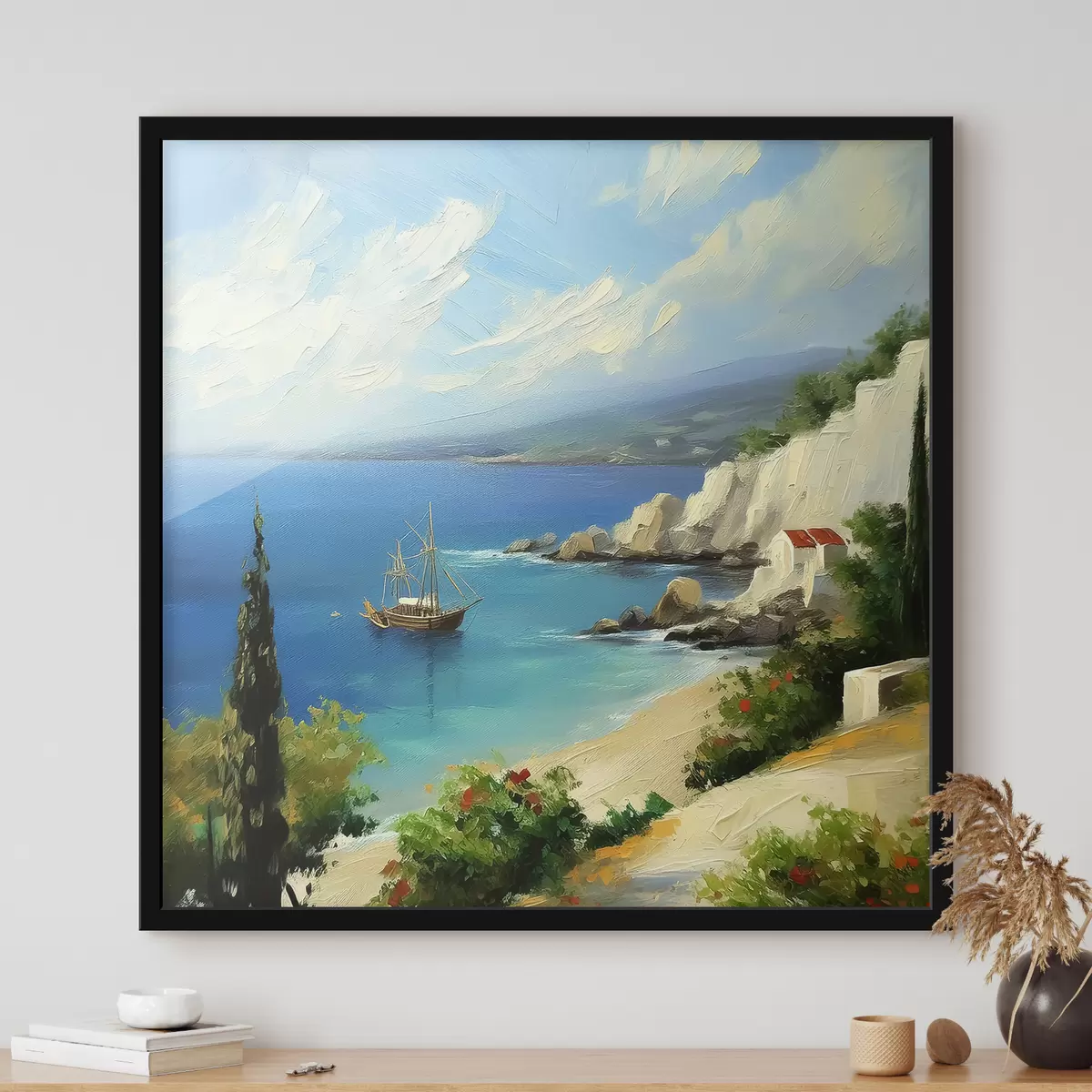 Poster Costa del mare della Grecia, nave, acqua blu, pittura a olio, natura estiva, rocce, pennellate vivaci f39425