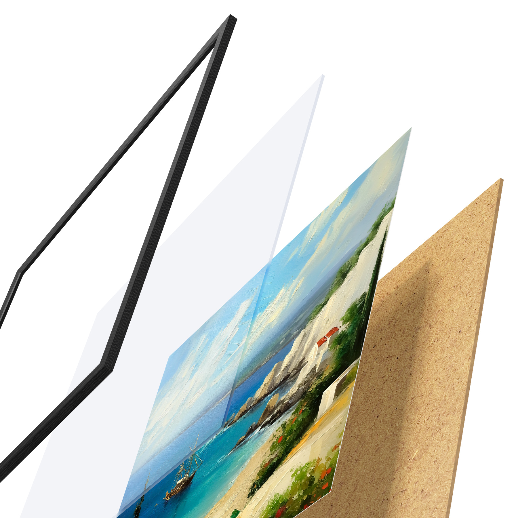 Il poster è composto da cornice, plexiglass, immagine stampata e supporto in truciolato. Il poster può essere immediatamente appeso alla parete grazie ai supporti sul retro.
