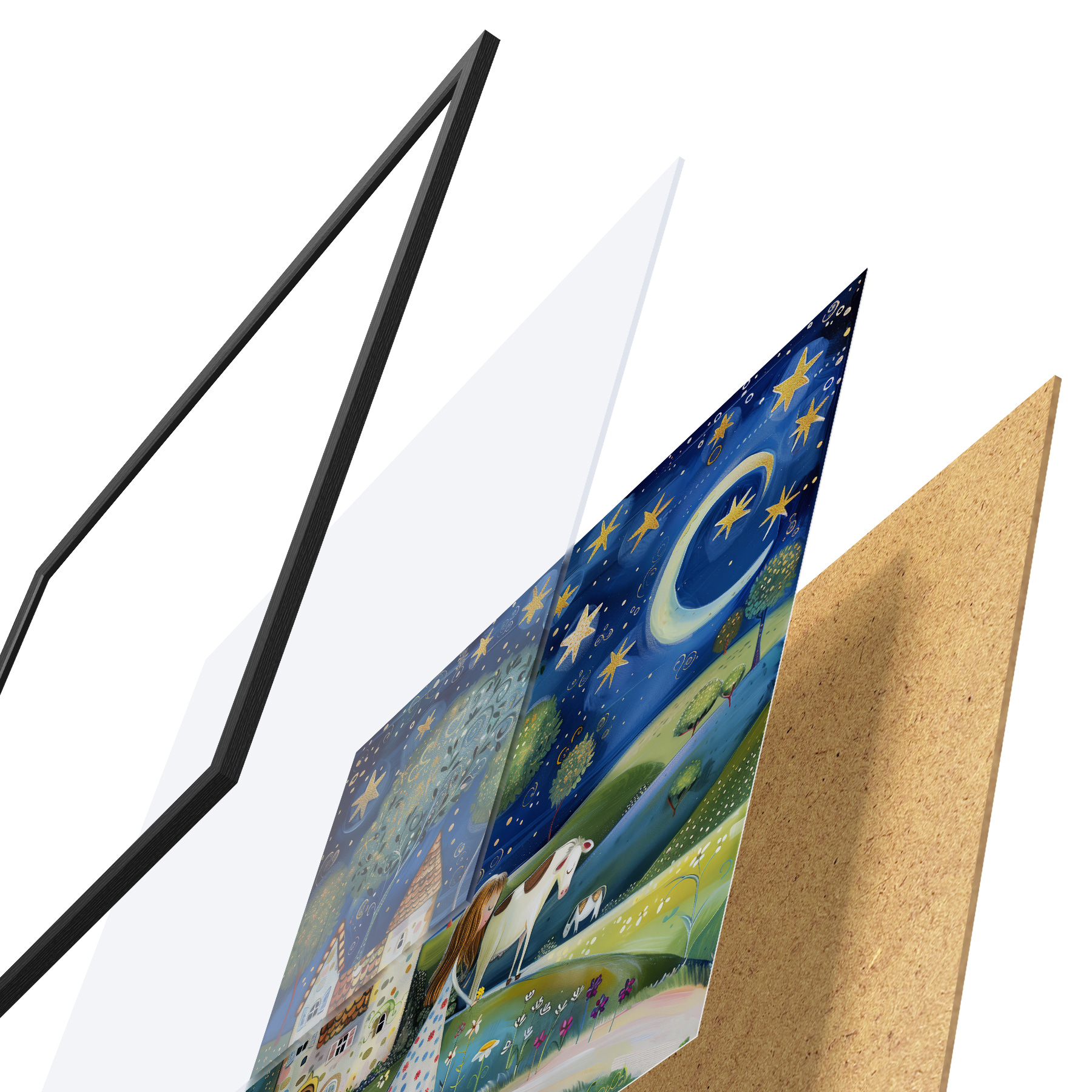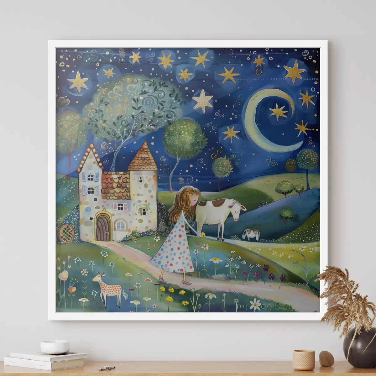 Poster Una piccola principessa, un cane, una mucca e una casa fantastica sotto le stelle in un bizzarro stile artistico ingenuo Nr f39451