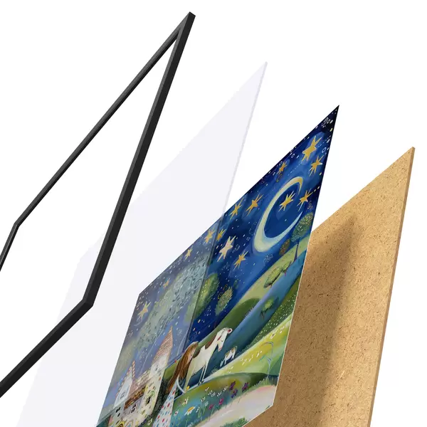 Il poster è composto da cornice, plexiglass, immagine stampata e supporto in truciolato. Il poster può essere immediatamente appeso alla parete grazie ai supporti sul retro.