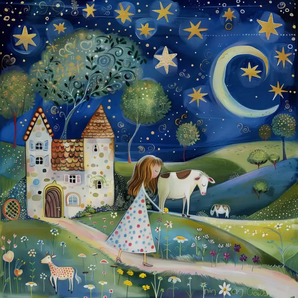 Poster Una piccola principessa, un cane, una mucca e una casa fantastica sotto le stelle in un bizzarro stile artistico ingenuo Nr f39451