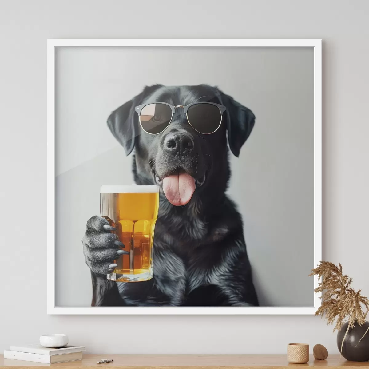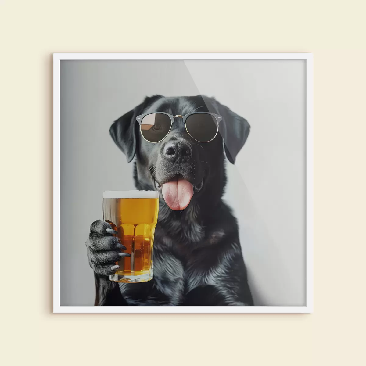 Poster Ritratto di un Labrador nero che indossa occhiali da sole e tiene in mano un boccale di birra, guardando dritto verso la fotocamera Nr f39470