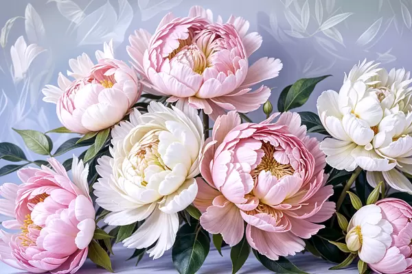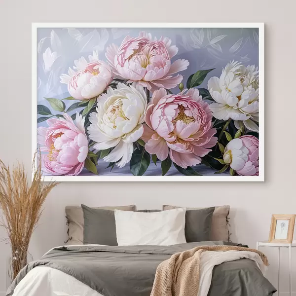 Poster Un bouquet di grandi e rigogliosi fiori di peonia rosa e bianca con foglie verdi su uno sfondo morbido e sfocato Nr f39514